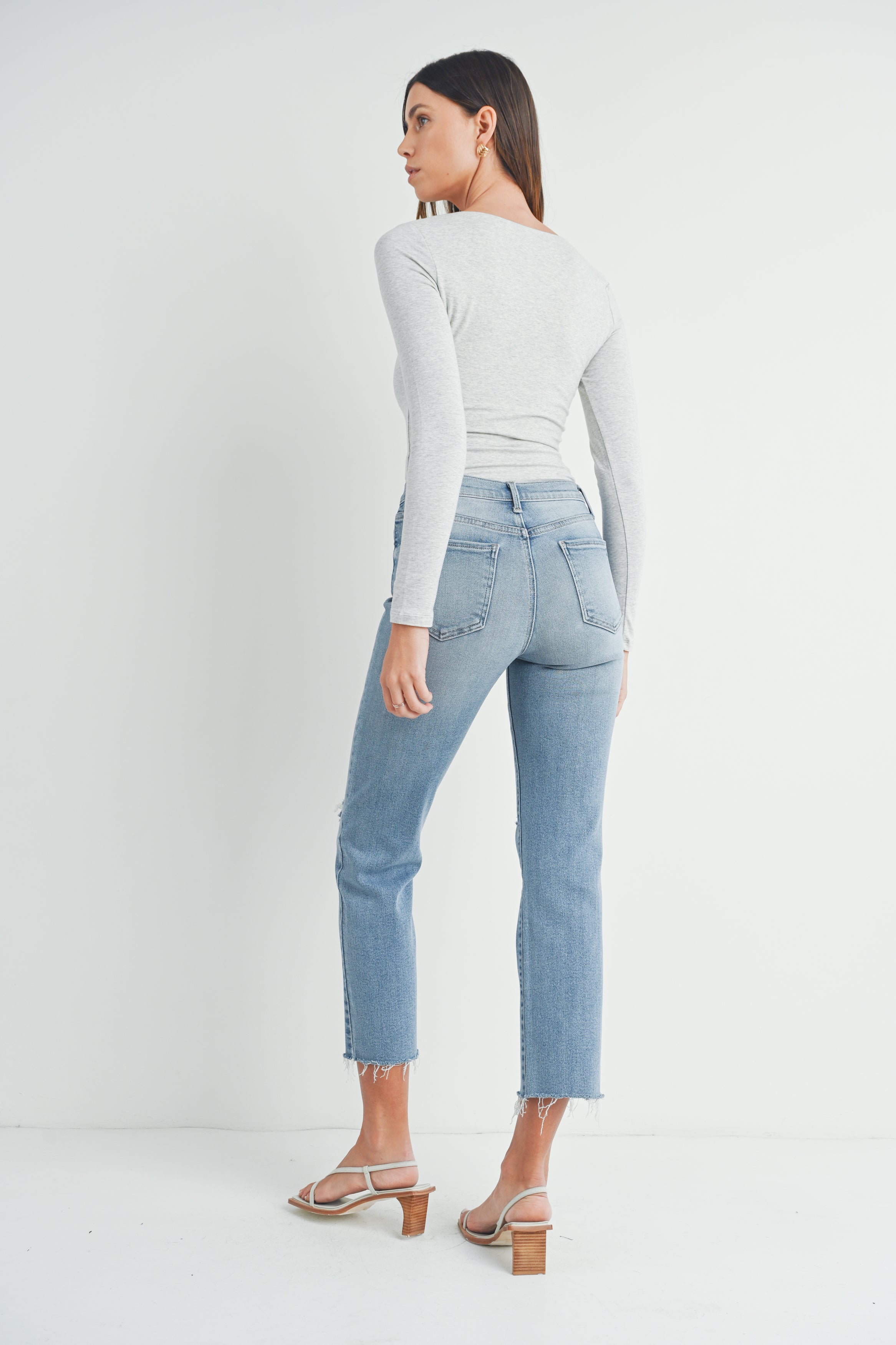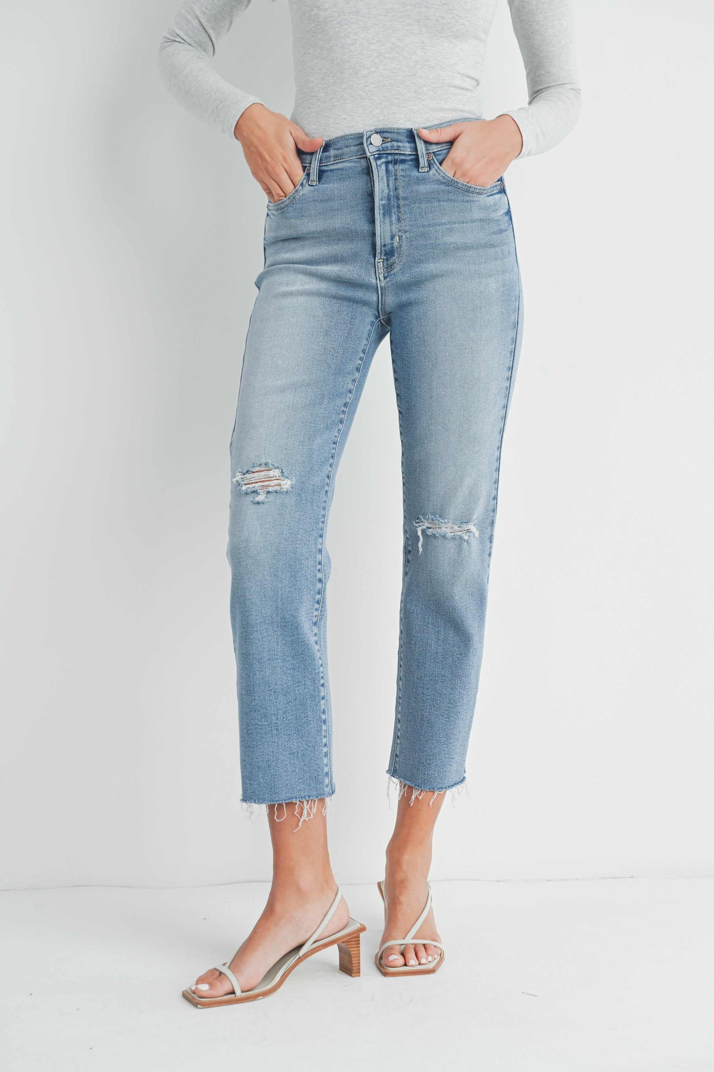 The Belen Jeans are slim fitting straight jeans with clean lines and ripped knees. This mid-rise pair has a teensy bit of stretch for comfort, and a slight crop for showing off your favorite shoes.