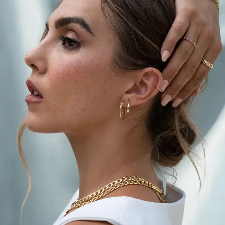 Now what makes a piece of jewelry waterproof? If it’s stated as gold filled then you’re in luck, it’s waterproof! The brand Heir is one of our favorites at Rose and Lee because all of the necklaces and earrings are 14k gold filled. The jewelry can be worn swimming in the ocean, withstand sweat from working out, and even the humidity in the air!