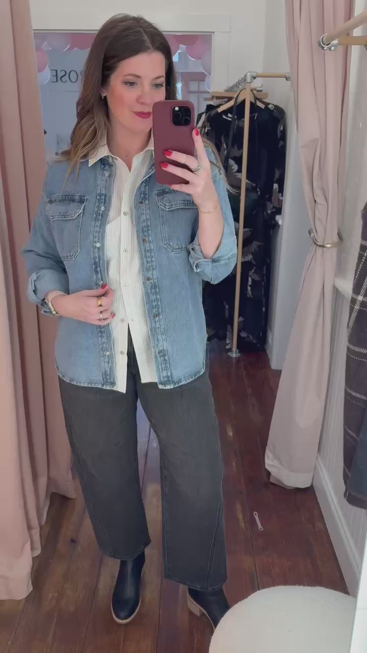 Effortlessly cool in an oversized silhouette, this laidback layer is featured in a button-down style with a collared neckline and pocket detail at the chest.
