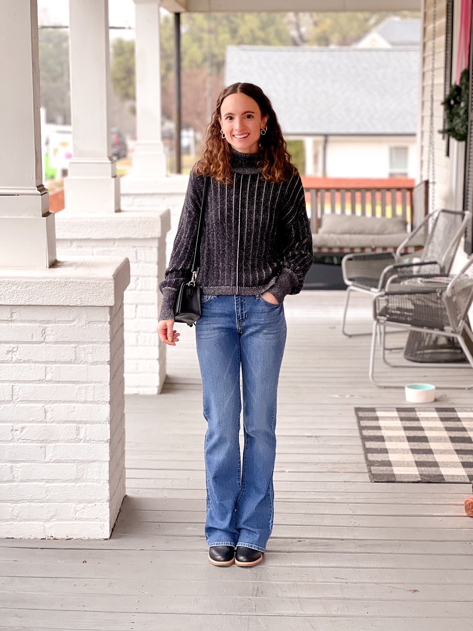 Introducing the Elliot Sweater—your new go-to for cozy sophistication with a playful twist. This long sleeve turtleneck features a chic black base adorned with delicate pearl-colored stripes that add just the right amount of visual interest. Perfect for layering over your favorite basics or wearing solo, the Elliot brings effortless elegance to any autumn or winter wardrobe. The soft turtleneck keeps you warm while the striped detailing keeps things fun and fresh. Whether you're heading to the office or settling in for a casual weekend, this sweater strikes the perfect balance between timeless and trendy.