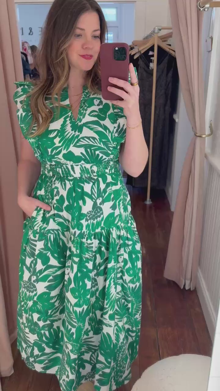 Say hello to your new summer favorite! The Masey Dress features a ruffle cap sleeve, a split neckline, and convenient pockets. The smocked waist adds a cute touch. Add strappy heels and matching accessories for a full look.