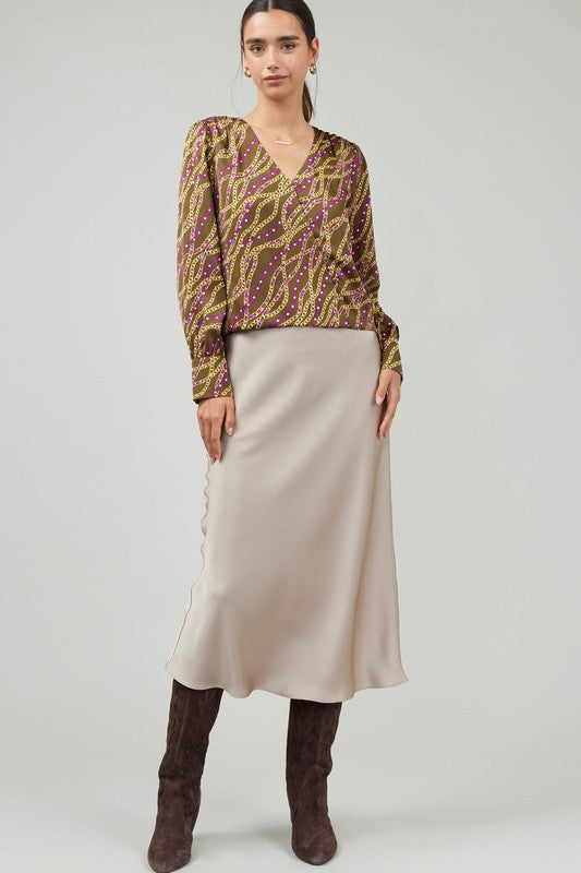 The Augustus Top is a feminine long sleeved blouse in a beautiful color mix of olive and wine! This top features a flattering v-neckline, a surplus top, a button front, and an abstract print. This top will definitely make a statement in the workplace!