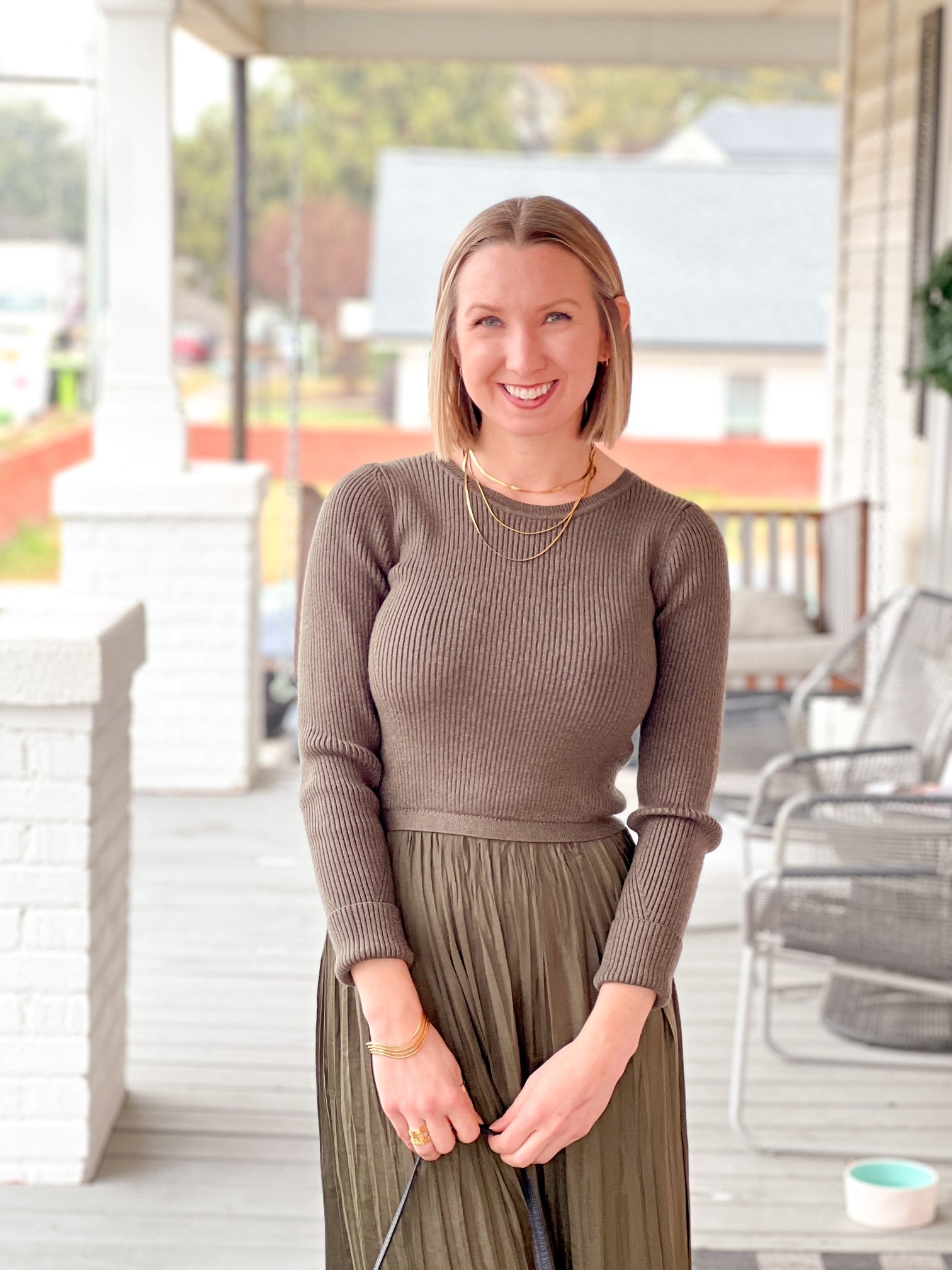 Elegant and understated, the Adalee Dress combines a ribbed knit bodice with a softly pleated woven skirt for a refined mixed-media look. The fitted top flatters the figure, while the flowy skirt adds graceful movement. Perfect for day-to-night wear, it pairs effortlessly with heels or boots for a timeless, sophisticated style.