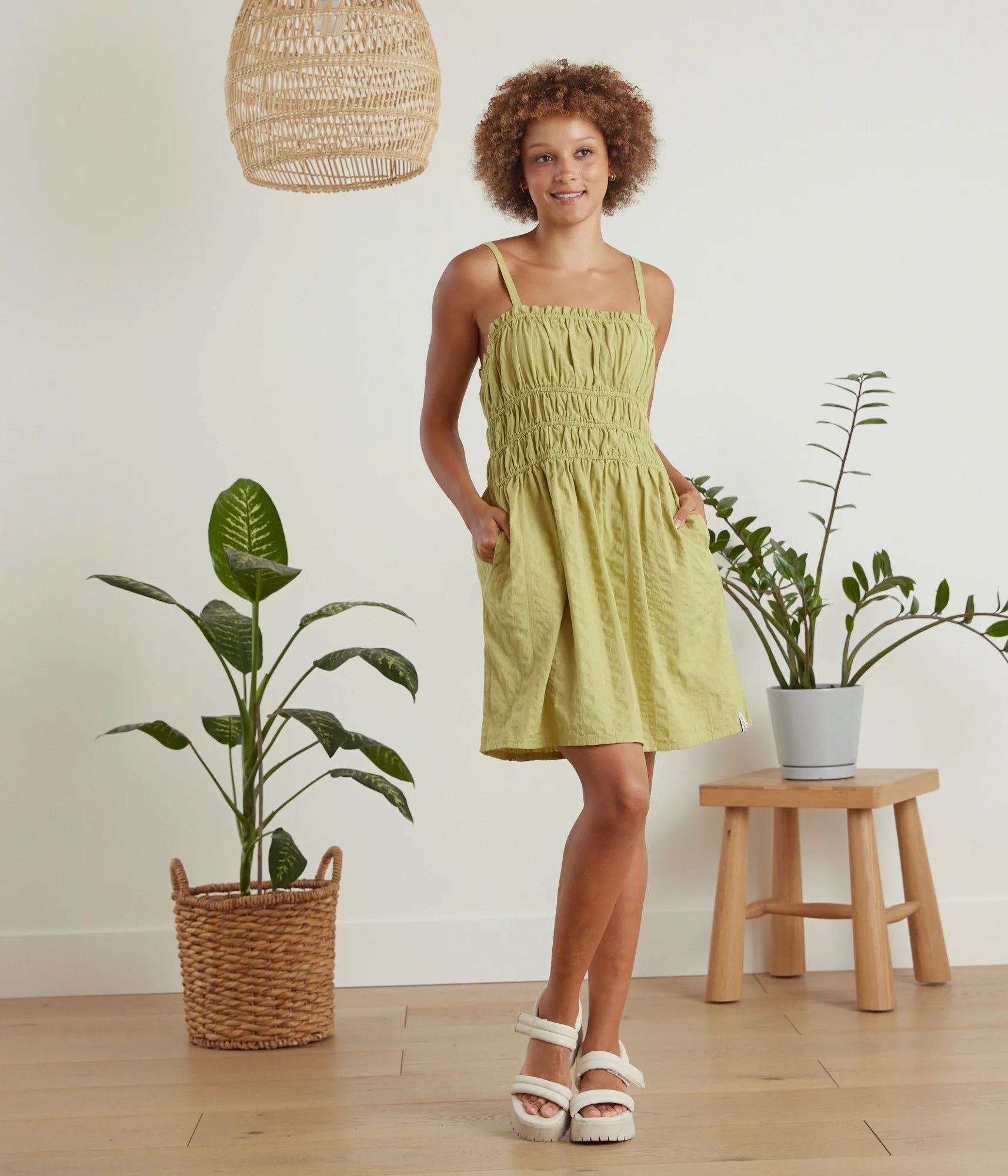 Get ready to turn heads in our Bayside Dress! This Matcha-colored dress features a sleeveless design, square neckline, and smocked bodice for a flattering fit. With adjustable shoulder straps and side pockets, this mini length dress is both stylish and functional. Perfect for any occasion!