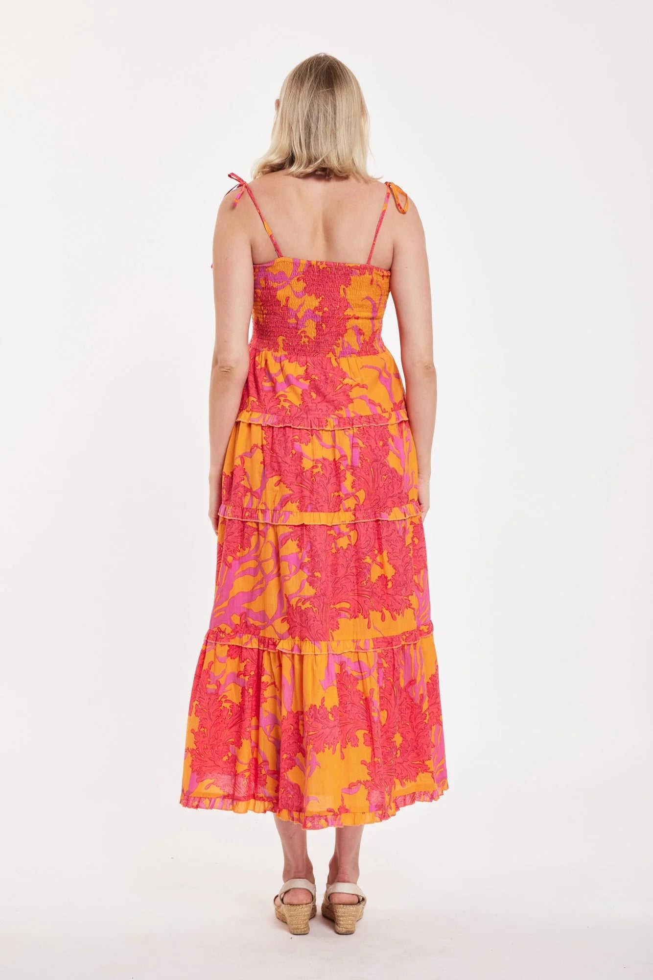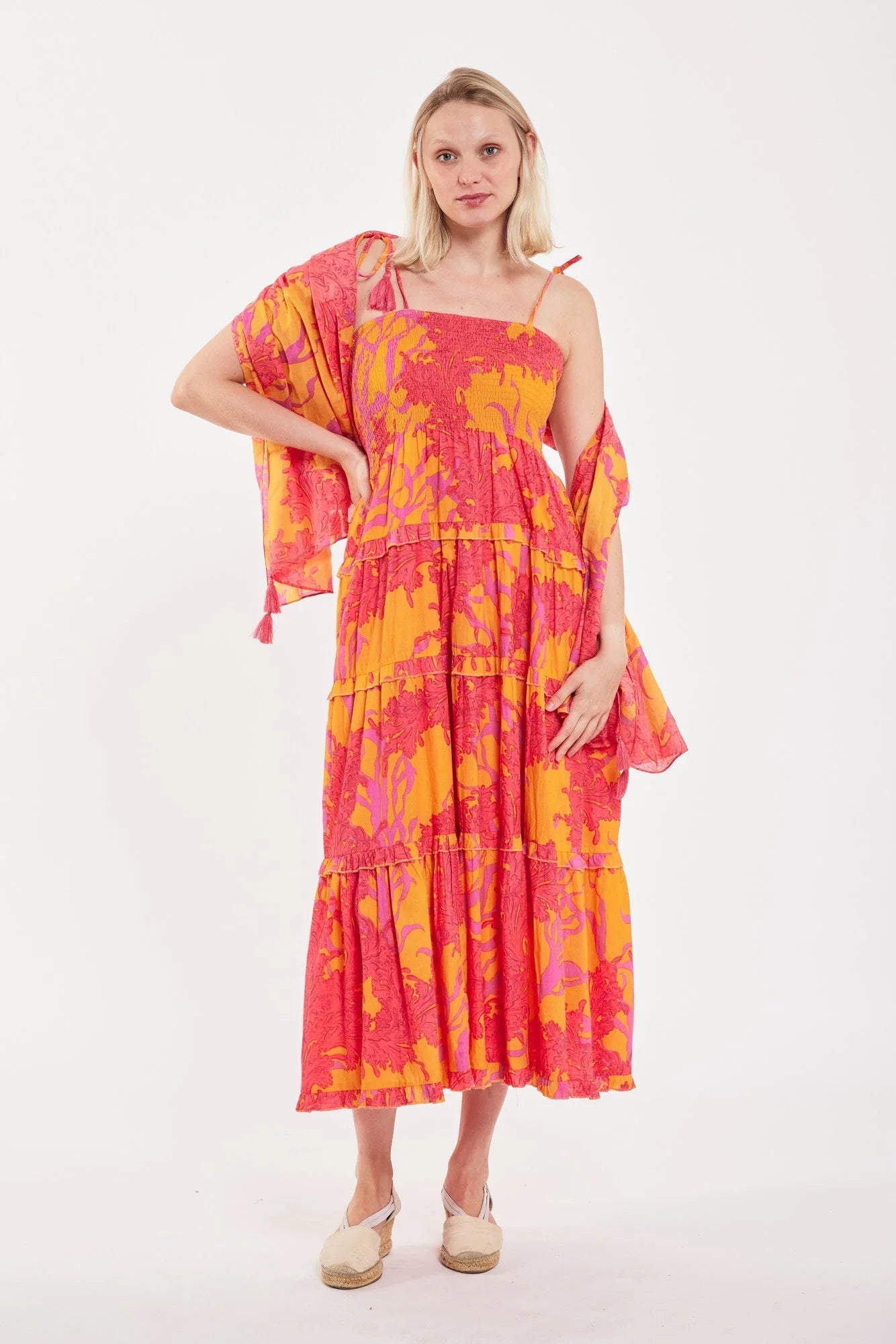 Be bold and beautiful in the Dianora Maxi Dress! This comfortable summer dress features a vibrant red coral and orange print, accented with playful tassels. Lined and smocked for added comfort, this maxi is perfect for any summer occasion.