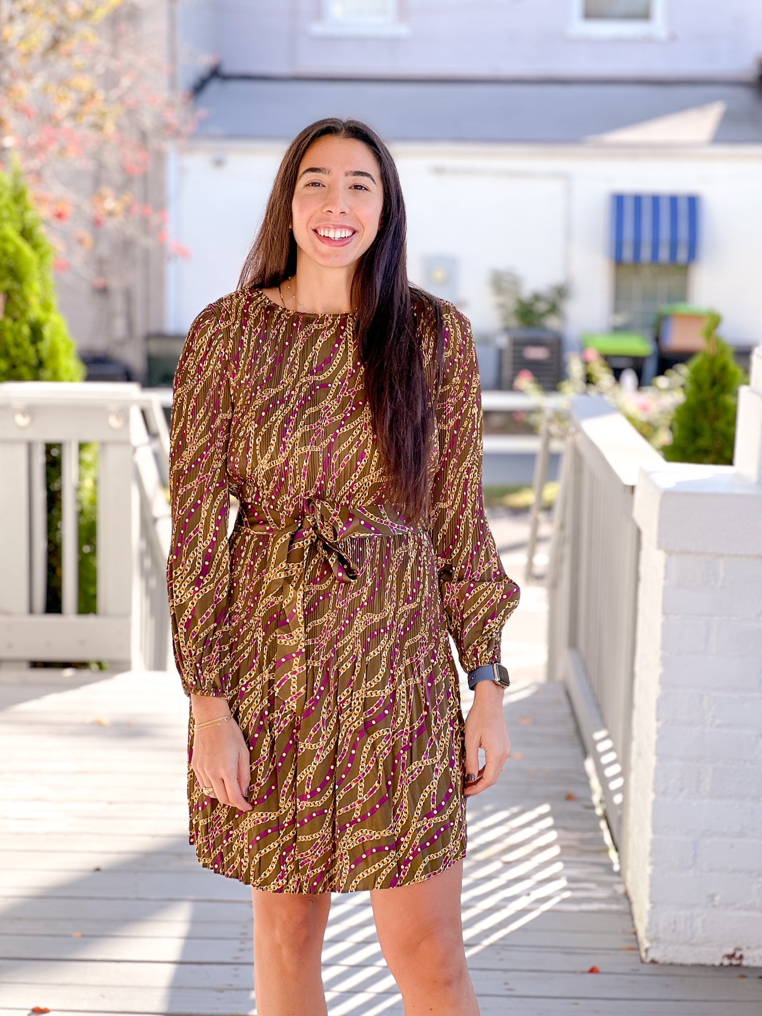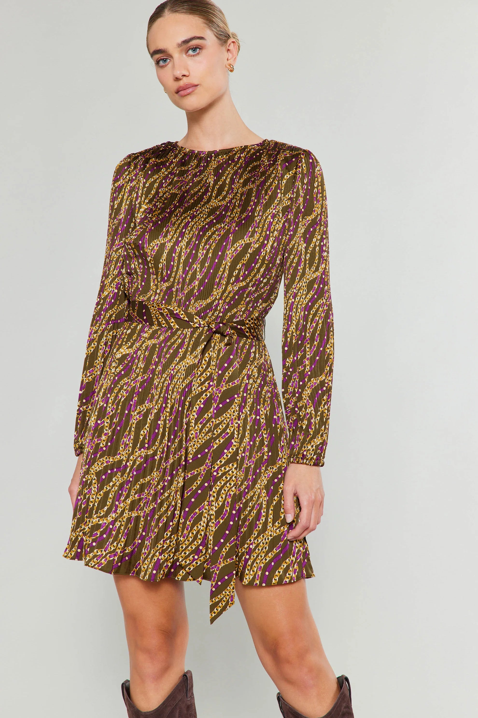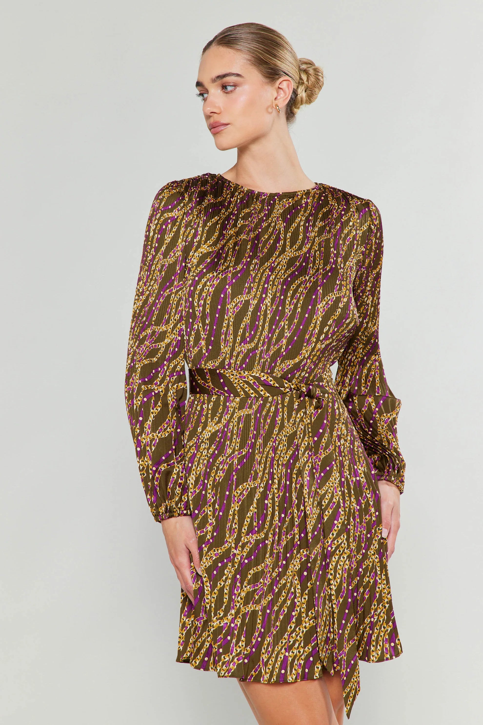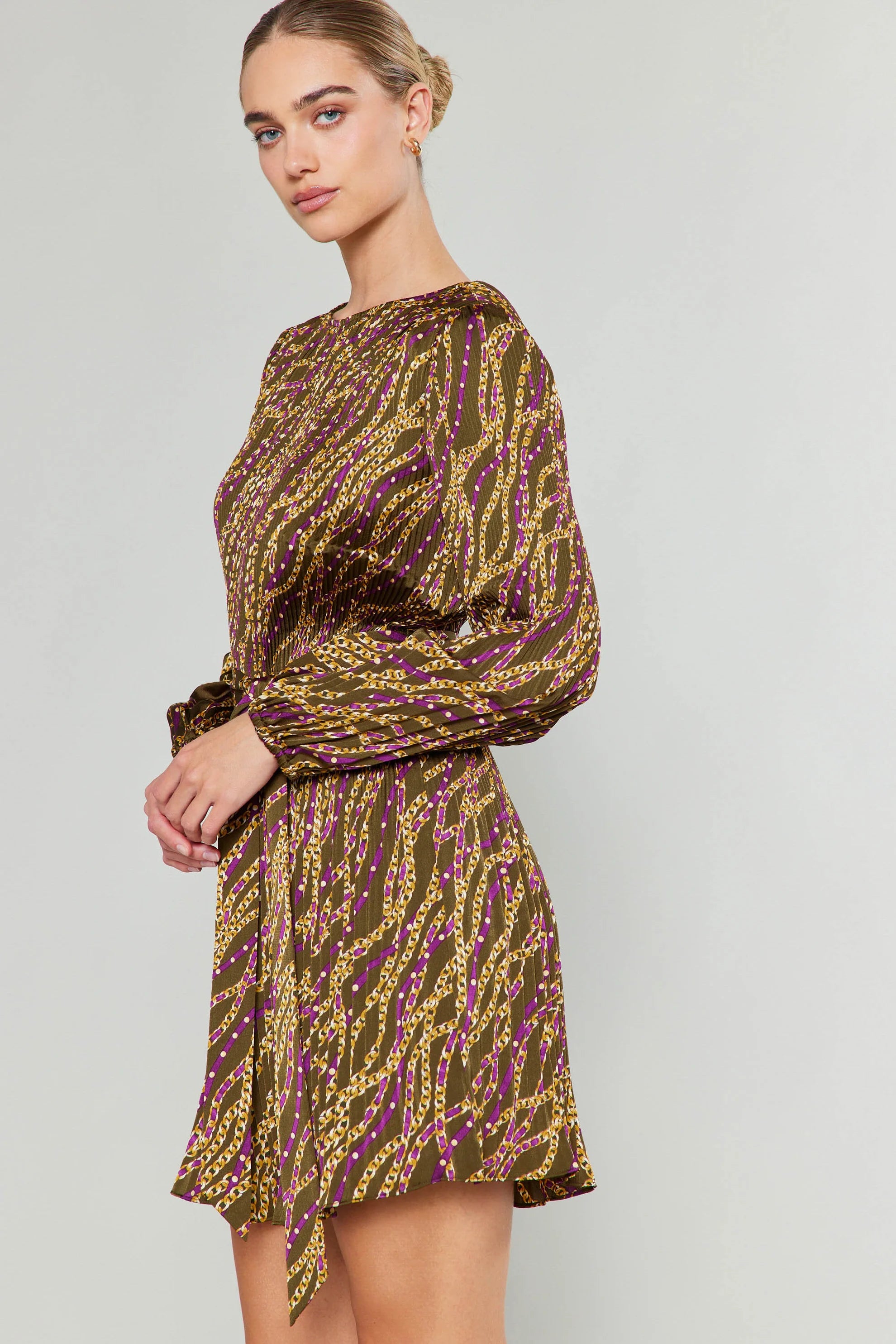 Light as a breeze, the Elise Dress is a golden link-printed mini dress that showcases blousy long sleeves, elasticized cuffs, and pleat detailing. A delicate self-tie at the neckline finishes the look.