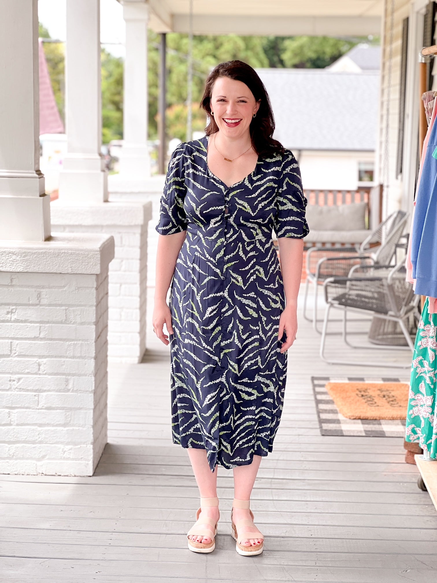 Emmy is wearing a size 38. We find that the Evola Dress runs true to size.