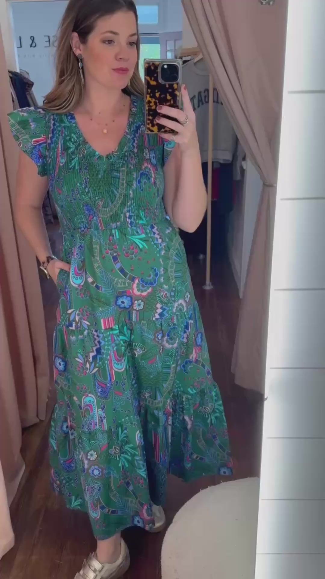 Soft, stylish, and stealing hearts one petal at a time. It features a flattering smocked bodice with a ruffle v-neckline, framed by ruffle cap sleeves. It maintains a fit and flare silhouette with a tiered maxi skirt. Lightweight cotton allows you to do your thing all day.