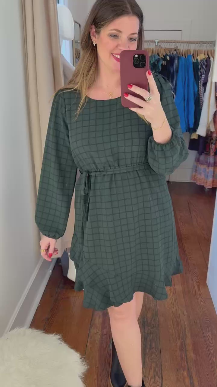 The Wren Dress blends timeless charm with a modern twist, featuring a dark green and black grid pattern that adds effortless sophistication. Its flattering square neckline and long sleeves create a refined silhouette, while the self-tie waist allows you to customize the fit. Finished with delicate ruffled detailing and a playful mini length, it’s the perfect dress for workdays, dinners, and everything in between.