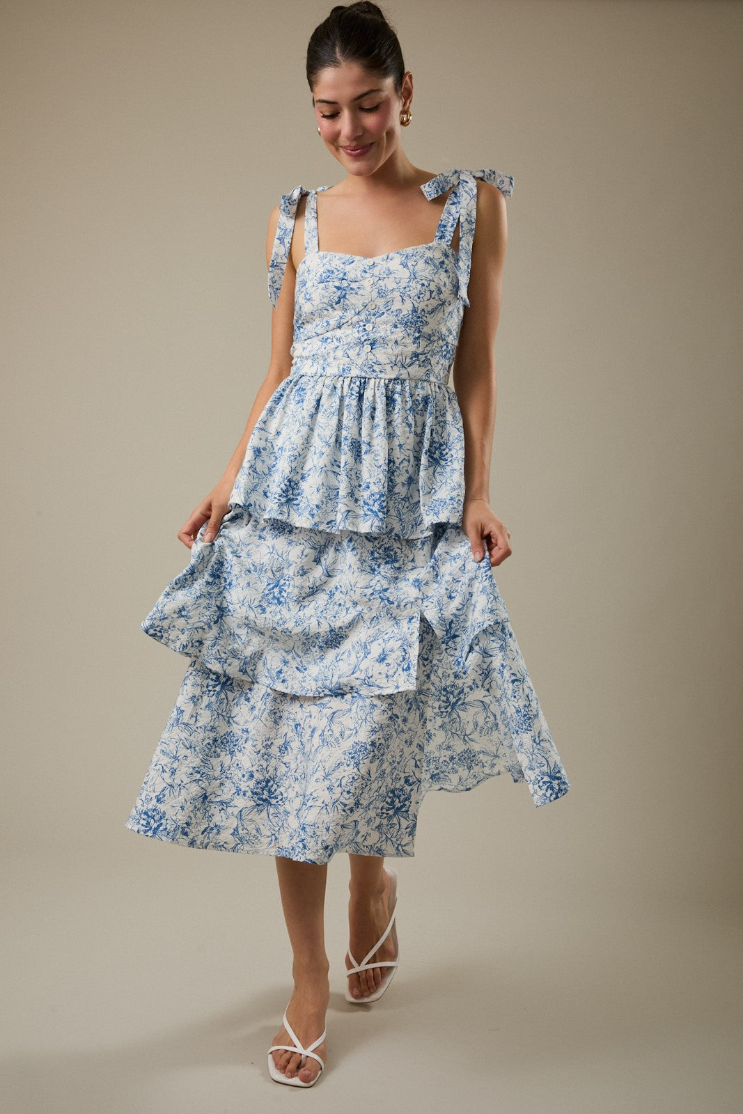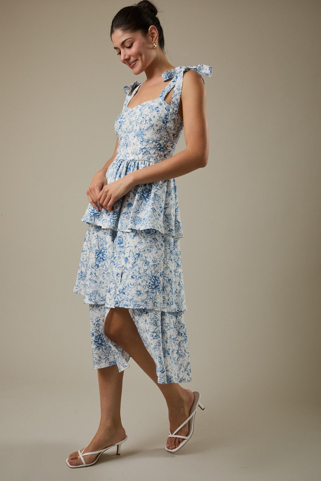Romantic and effortlessly breezy, the Harley Dress is made for sunny days and special moments alike. Designed in a soft cream and blue floral print, this sleeveless midi features a flattering sweetheart neckline and adjustable tie straps for a customizable fit. The tiered silhouette adds graceful movement, while a subtle side slit brings a touch of allure. Perfect for brunch, vacations, or outdoor events, it’s a feminine favorite with an easy, elegant feel.