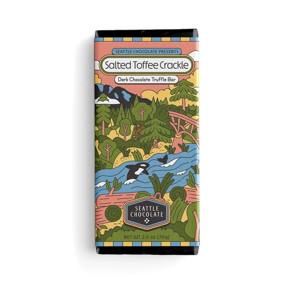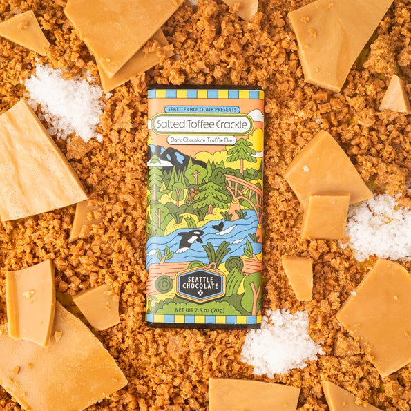 This dark chocolate truffle bar has a generous sprinkling of crunchy toffee bits and a dash of Pacific Sea salt with fresh graphics featuring iconic elements from the Pacific Northwest. If you look close enough, you'll see something special peeking from the forest scene.