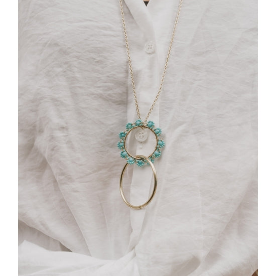 Our Jatasya Collection combines traditional techniques of beading and jewelry making art forms in alluring, modern, teal and gold designs. This handcrafted hoops pendant necklace features one shiny gold finish hoop and one gold finish hoop wire wrapped with faceted turquoise glass seed beads fringe. Glass seed beads are skillfully interwoven by master artisans in New Delhi to achieve this refined design, a rich expression of age-old, ornate design motifs.