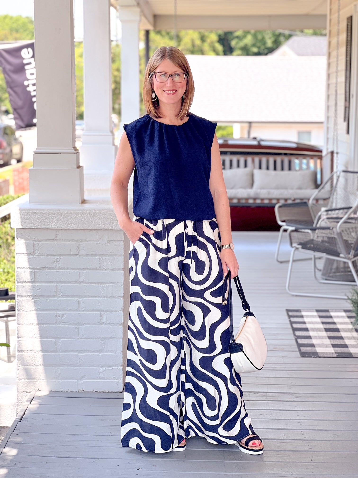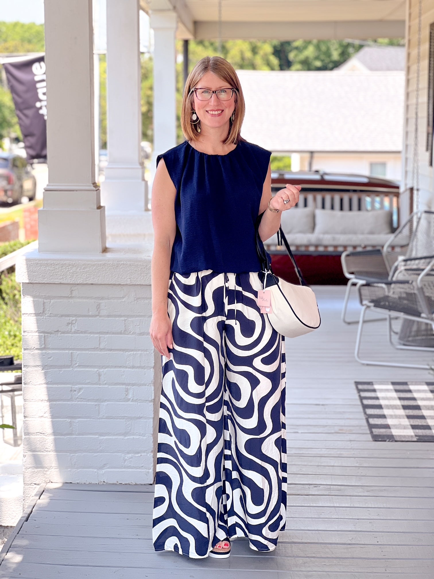 Meet your new warm-weather essential: The Graphite Pant. Designed for comfort and effortless style, this black and white patterned palazzo pant brings movement, ease, and personality to your summer wardrobe.