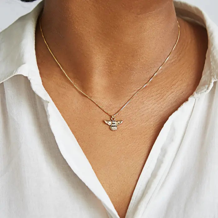 This dainty and beautiful gold pave bee necklace will add a touch of sparkle to any look.