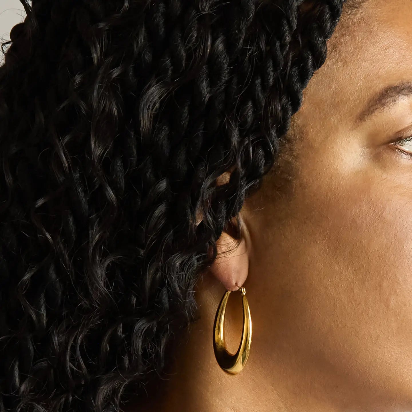 We have made our best-selling large gold oval hoop earrings. These beautiful earrings are made hollow for a lightweight but 'heavy-looking" feel. Perfect for an everyday look that can be stacked with our other tiny studs.
