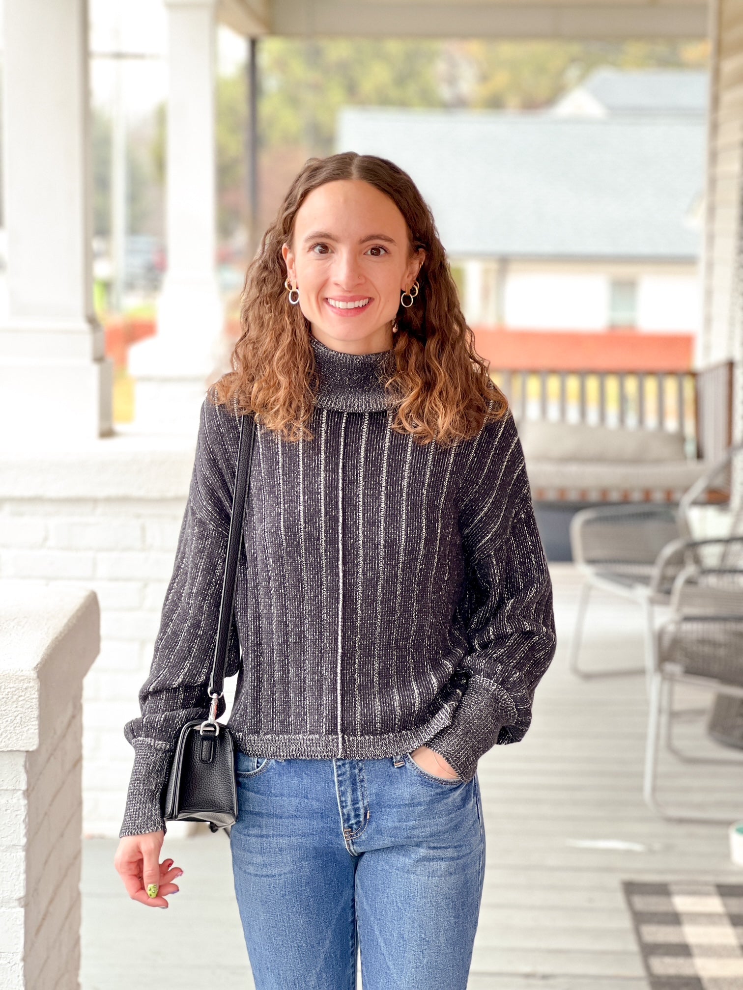 Introducing the Elliot Sweater—your new go-to for cozy sophistication with a playful twist. This long sleeve turtleneck features a chic black base adorned with delicate pearl-colored stripes that add just the right amount of visual interest. Perfect for layering over your favorite basics or wearing solo, the Elliot brings effortless elegance to any autumn or winter wardrobe. The soft turtleneck keeps you warm while the striped detailing keeps things fun and fresh. Whether you're heading to the office or settling in for a casual weekend, this sweater strikes the perfect balance between timeless and trendy.
