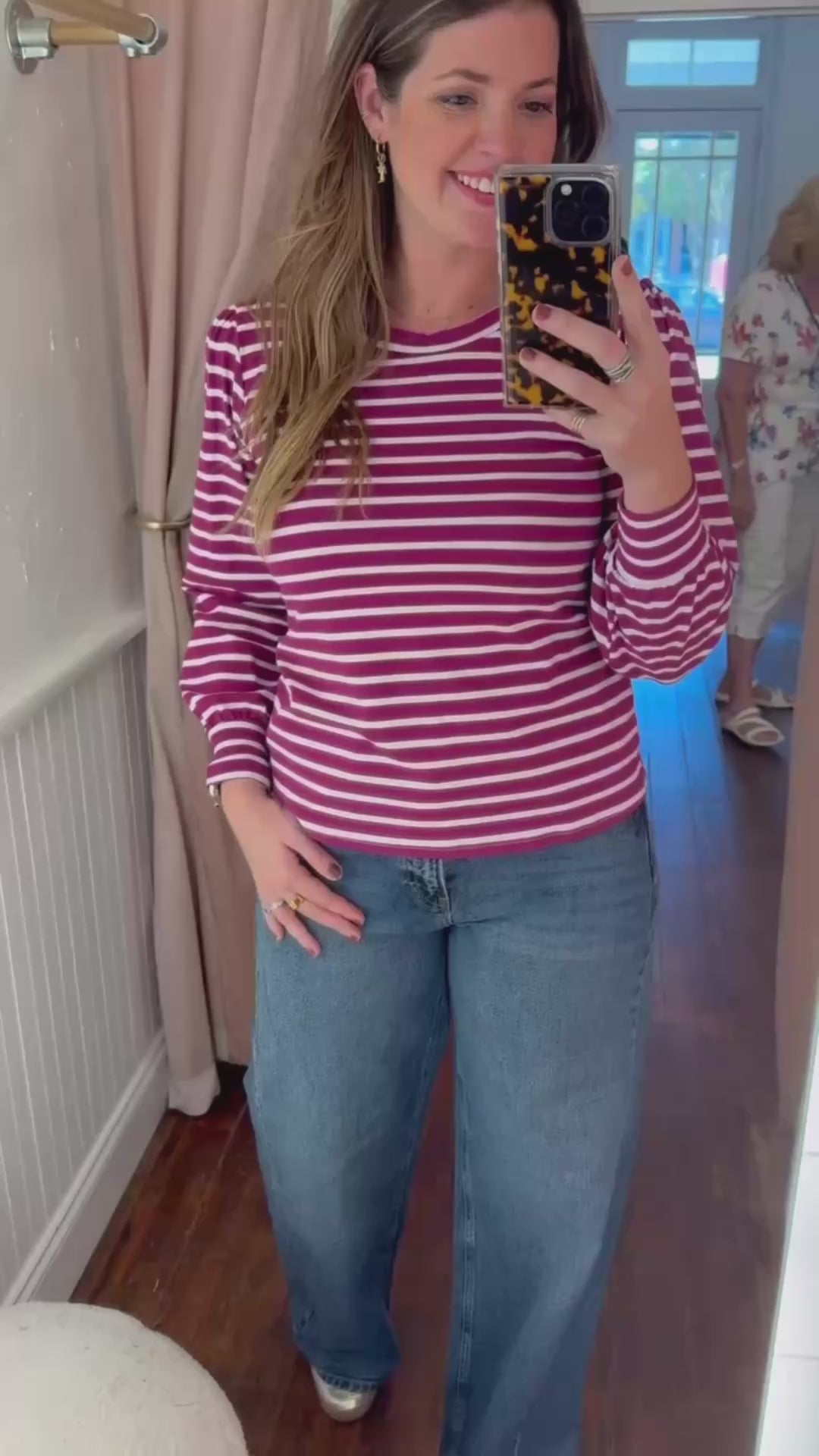 Everyone needs a striped long sleeve top in their wardrobe, so add the Amias Top to yours! This tops features a bright magenta and white striped print and subtle puff sleeves.