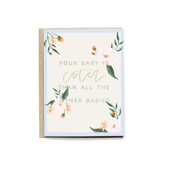 Celebrate the arrival of the cutest baby with this pastel, baby blue greeting card adorned with delicate floral designs. Express your sentiment with a touch of humor: "Your baby is cuter than all the other babies." ('Cause let's be real, they are.)