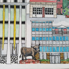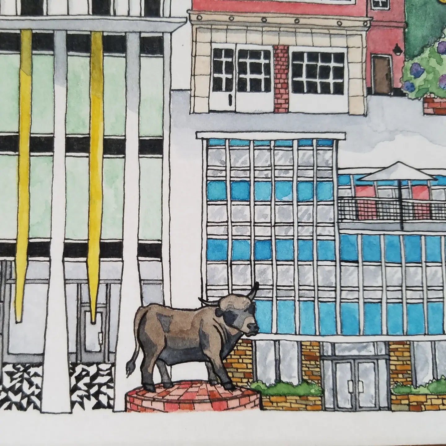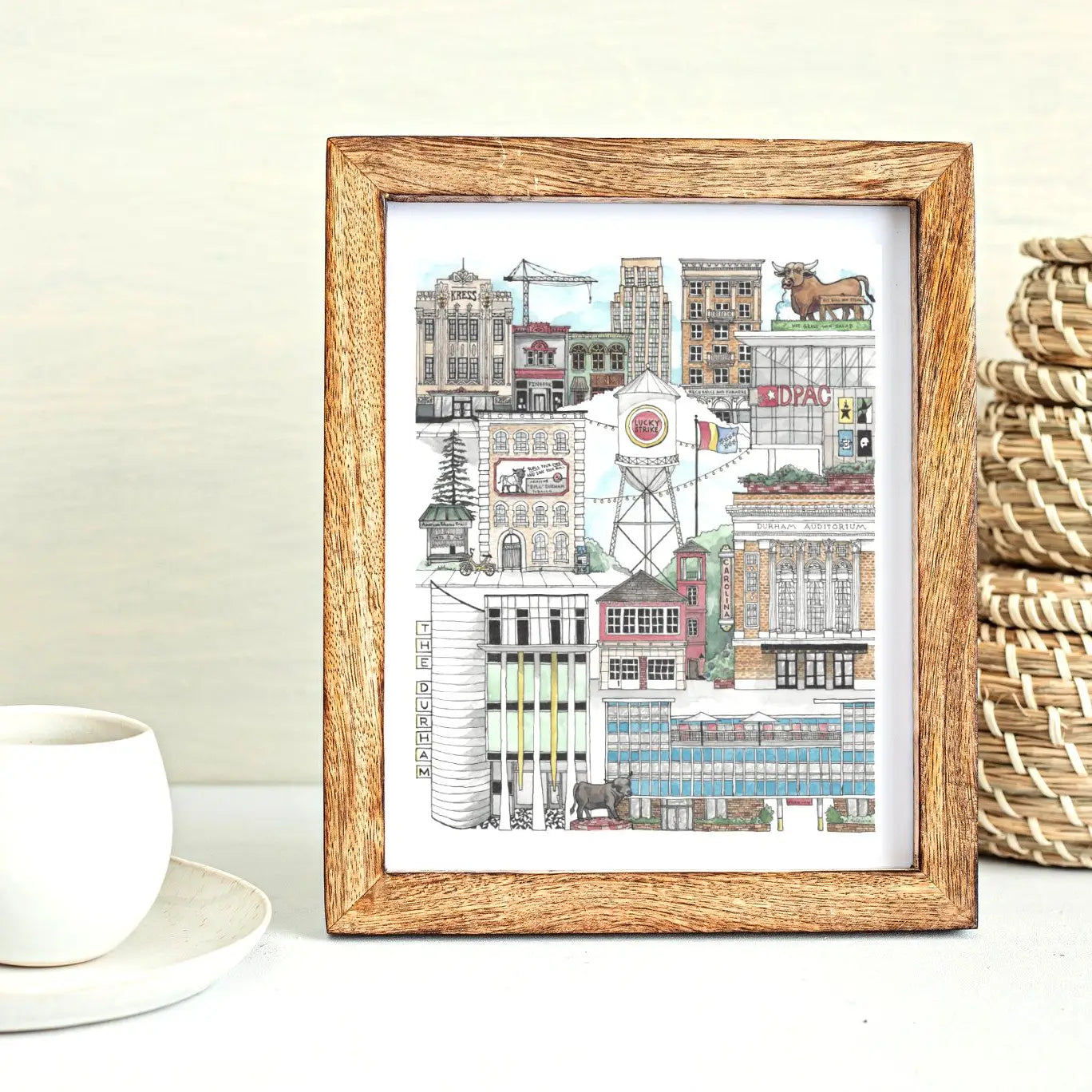The artwork features iconic and historic downtown landmarks like the Lucky Strike Tower at the American Tobacco Campus, the Major the Bull statue, the Durham Hotel, DPAC, Carolina Theater, the Kress building and much more.