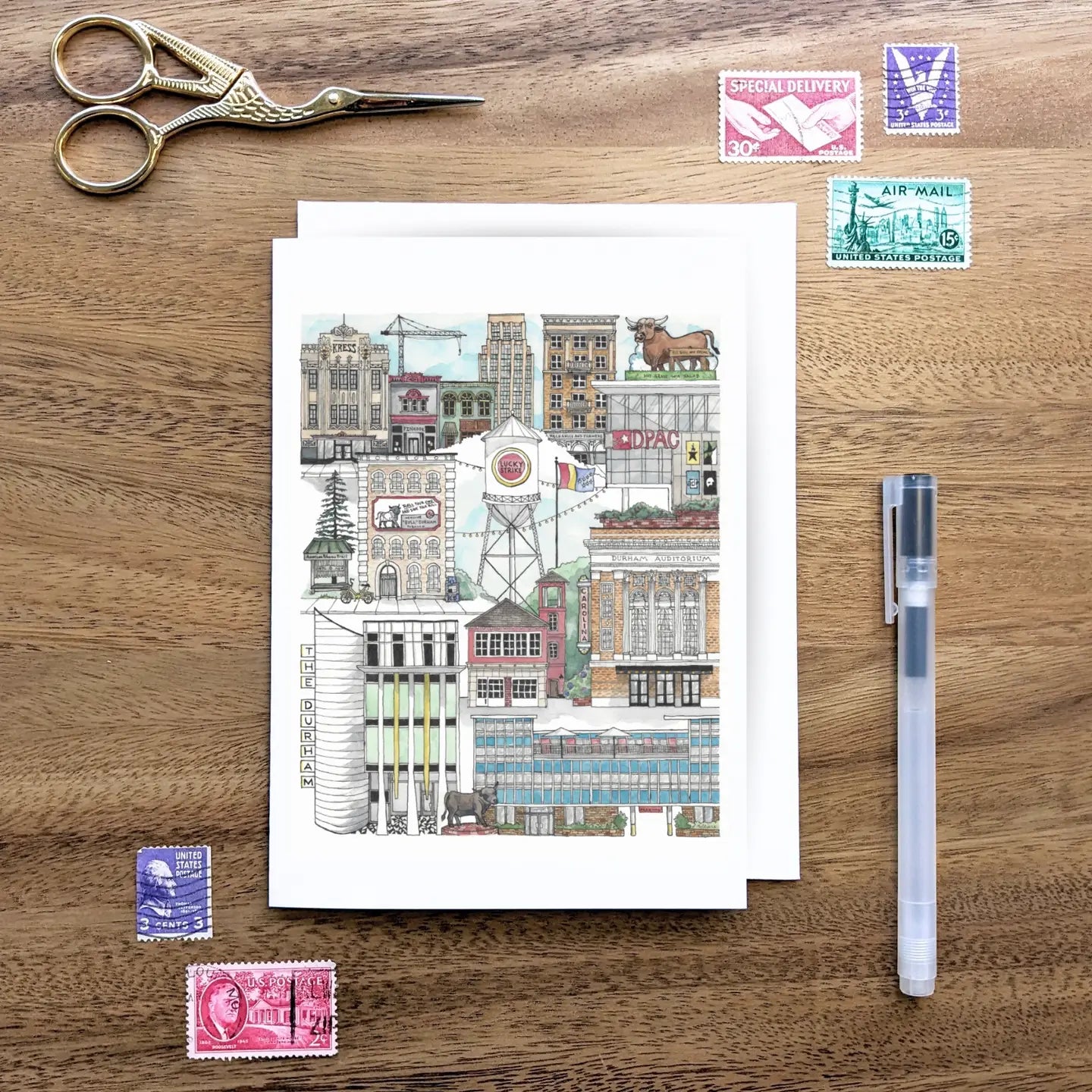 The vibrant and detailed art on this notecard was created by a pen-and-ink and watercolor artist based in Durham, North Carolina, and is filled with the Bull City's history-rich landmarks.