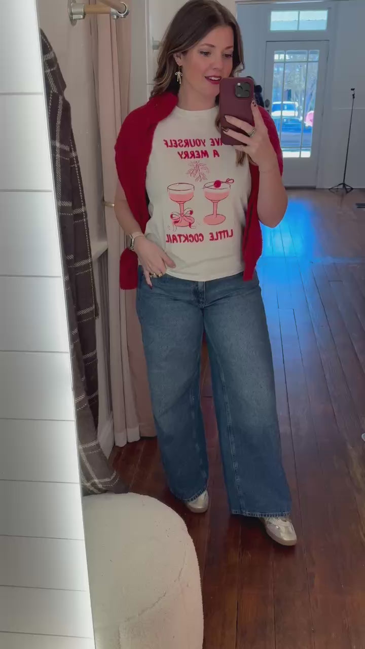 Have yourself a merry little cocktail this Christmas season! Our Merry Little Cocktail Tee is a festive and colorful graphic tee. This relaxed fit tee is perfect to throw on after a holiday get together!