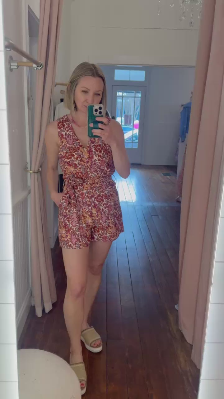 Fresh and feminine, the Karlee Romper is the perfect warm-weather staple. Designed with a flattering v-neckline and surplice top, it creates a beautifully draped silhouette. The elastic waistband and self-tie detail define the waist for a customizable fit, while side pockets add everyday convenience. Sleeveless and effortlessly chic, this floral romper is ideal for brunch dates, vacations, and sunny days out.