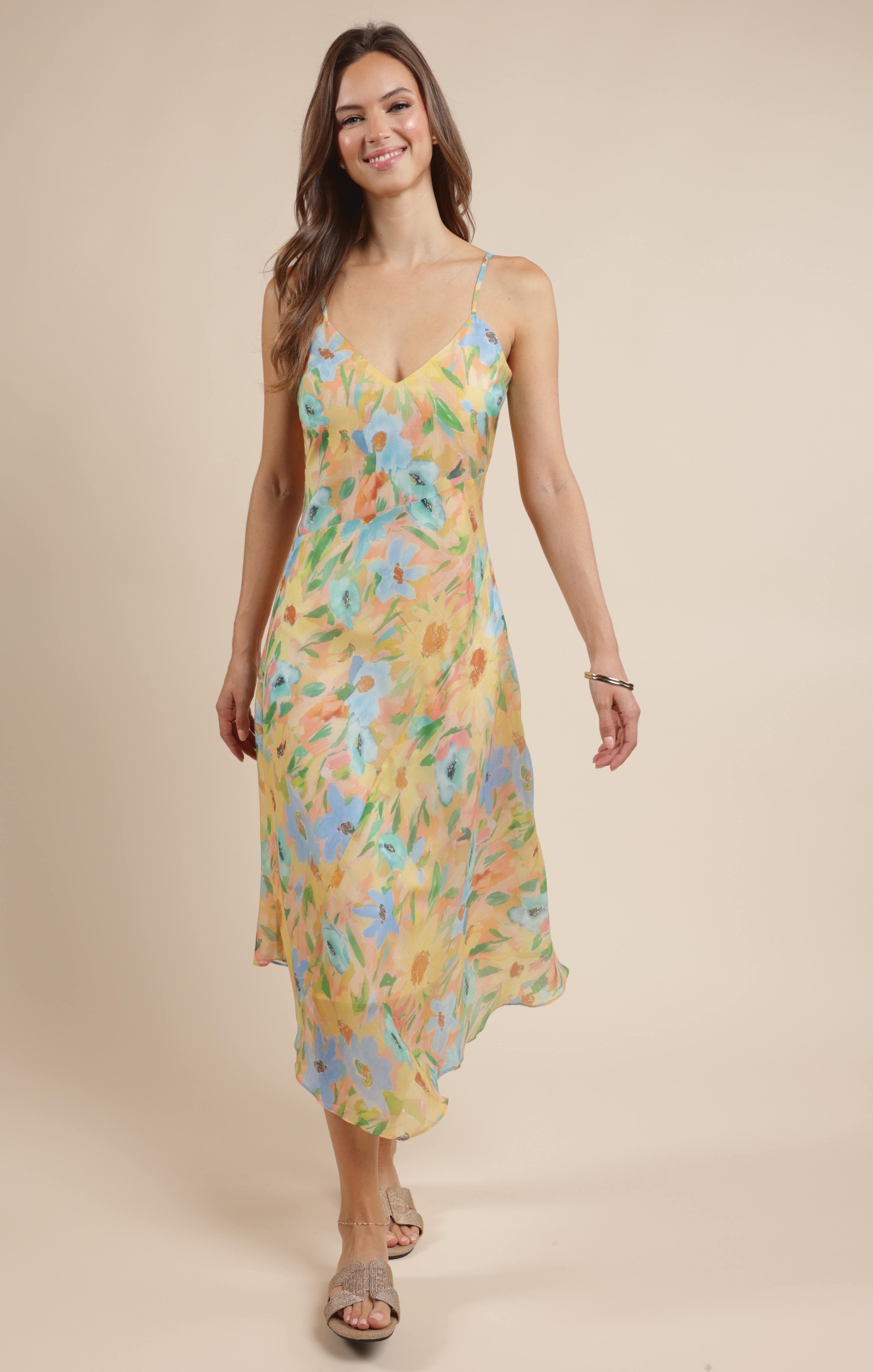 Introducing our Daisy Chain Dress - a flowy, sleeveless maxi dress with a vibrant yellow and multi-colored floral pattern. Perfect for any occasion, this dress will make you stand out in the crowd with its playful and colorful design. The V neck adds a touch of elegance, while the maxi length ensures comfort and coverage. Don't be afraid to add some fun to your wardrobe with this unique piece!