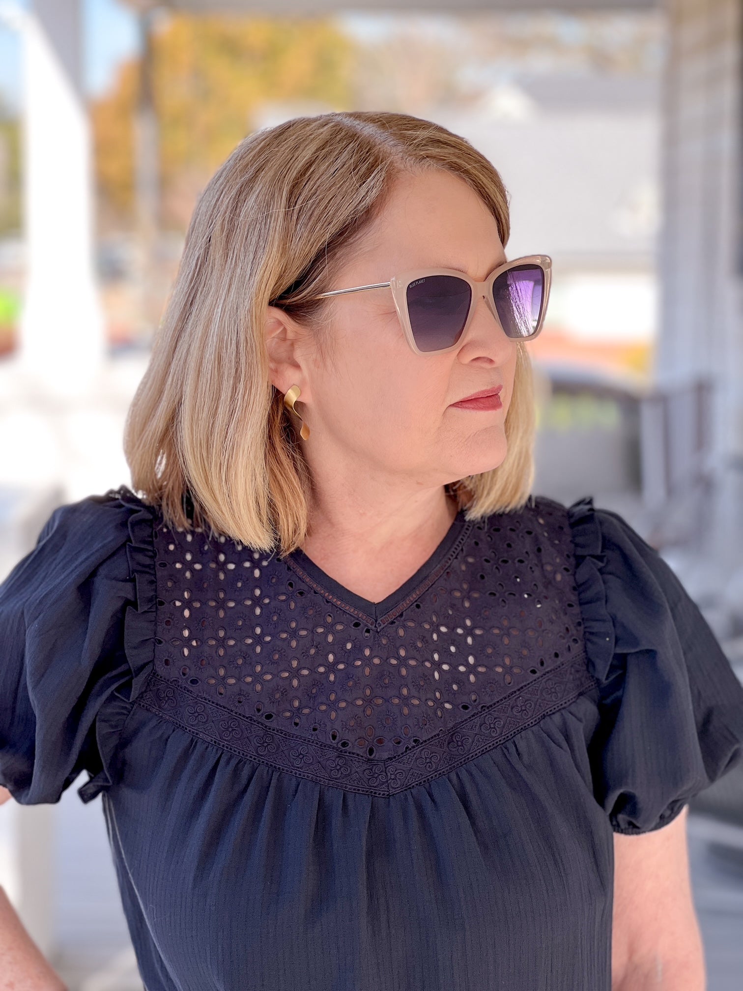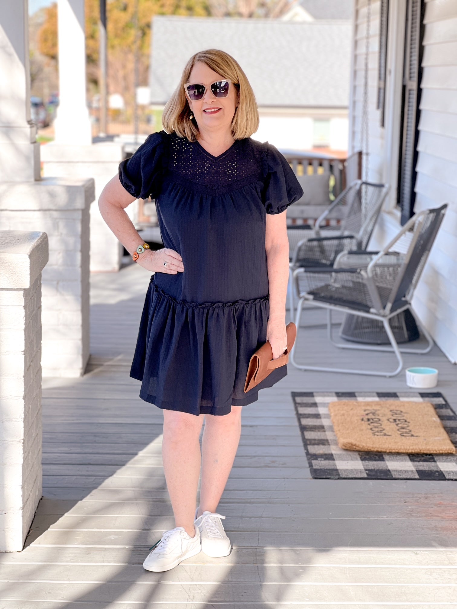 Elevate your style game with the Belle Dress in Dark Navy. This playful mini dress features short puff sleeves and a ruffled tiered hem for a touch of whimsy. The eyelet bib neckline adds a unique touch, making it the perfect piece for any occasion. (Hot tip: Pair with some cute booties, sneakers or heels for the ultimate trendy look!)