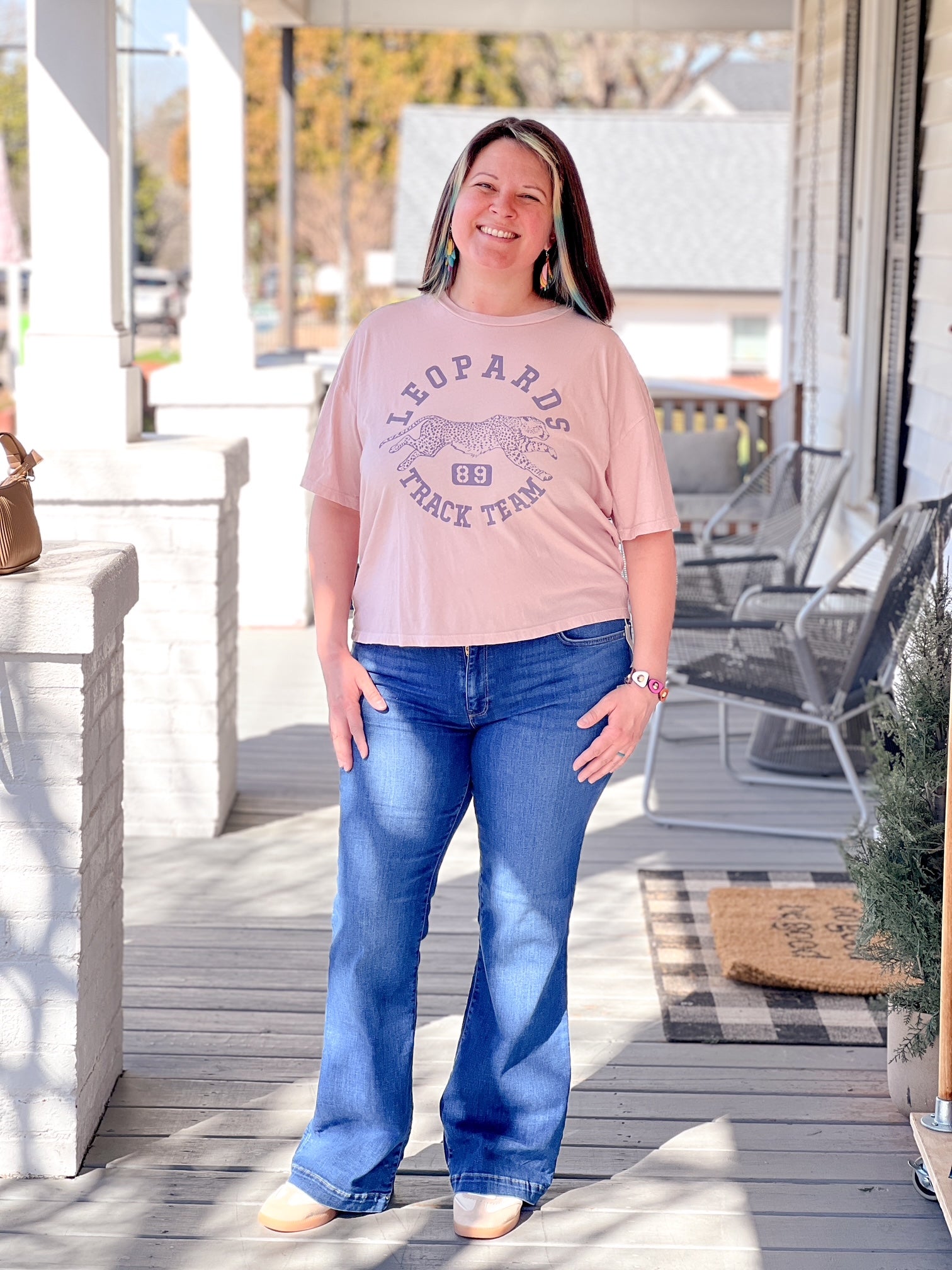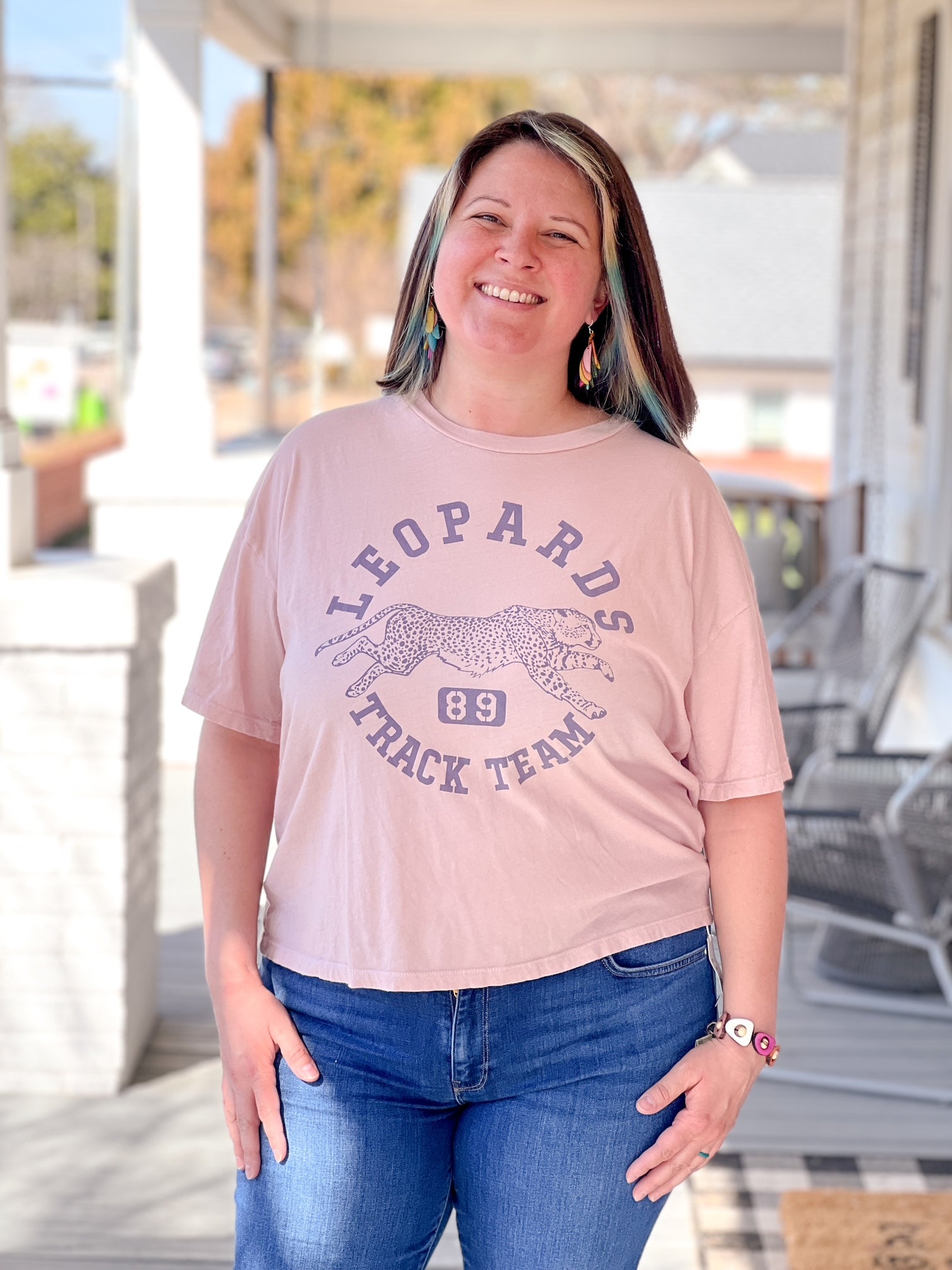 Get comfortable in our Leopards Track Team Top, a casual graphic print tee that has a relaxed fit. Dress this top up with jeans and a denim jacket, pair it with a skirt, or dress it down with leggings or sweatpants!