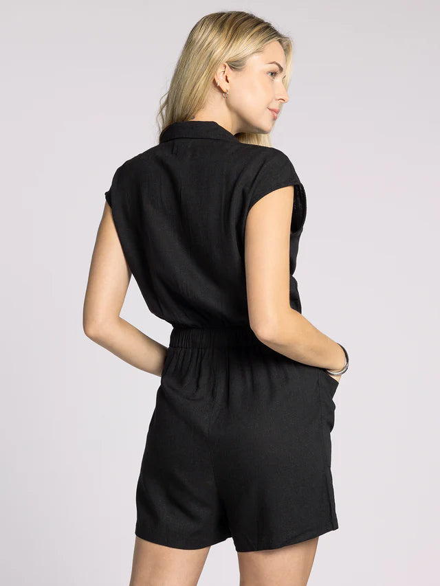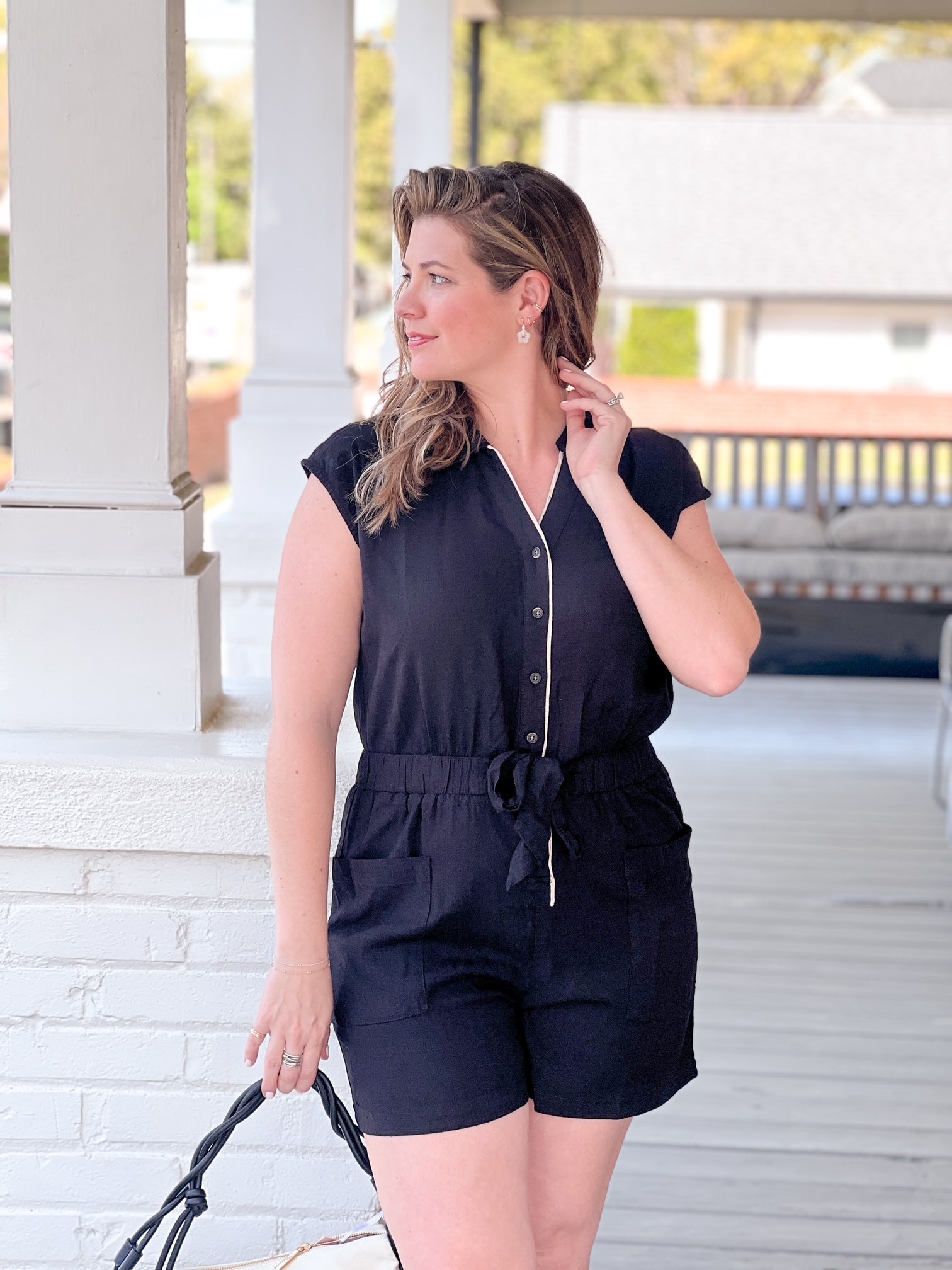 So easy, one-and-done outfit with this wear-anywhere romper, featuring an elastic waist with tie, cap sleeves and contrast button front piping.
