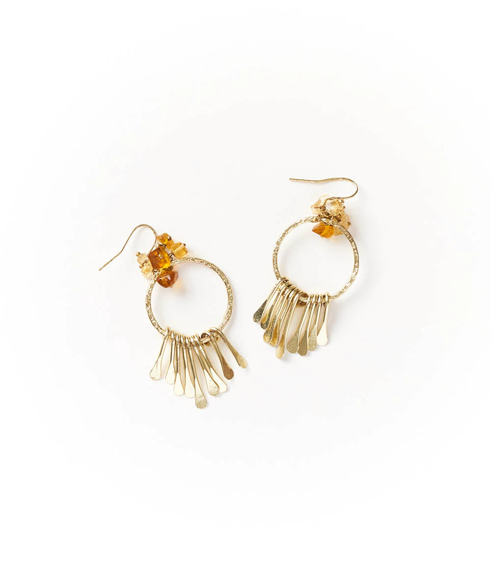 Our vibrant Ridhi Semi-Precious Citrine & Sunstone Collection channels the energy of this gemstone in refined, boho chic designs. Citrine and Sunstone are high vibration stones, channeling the energy of light from the sun. Citrine is revered as a stone of success and abundance, promoting optimism, attraction, and manifestation. It is associated with dispelling negative energies, powerfully transforming negative thoughts and feelings into positive ones. Sunstone is revered as a stone of joy and leadership, aligning positivity in mind, body and spirit. It is associated with enhancing self confidence, direction, and the ability to share your light with others. These handcrafted, fringe hoop earrings feature shiny, textured, gold finish hoop charms with gold finish tassel charms and genuine semi-precious Citrine and Sunstone gemstone chip tassel charms. Traditional jewelry making techniques of Old Delhi are thoughtfully applied in this inspired design.