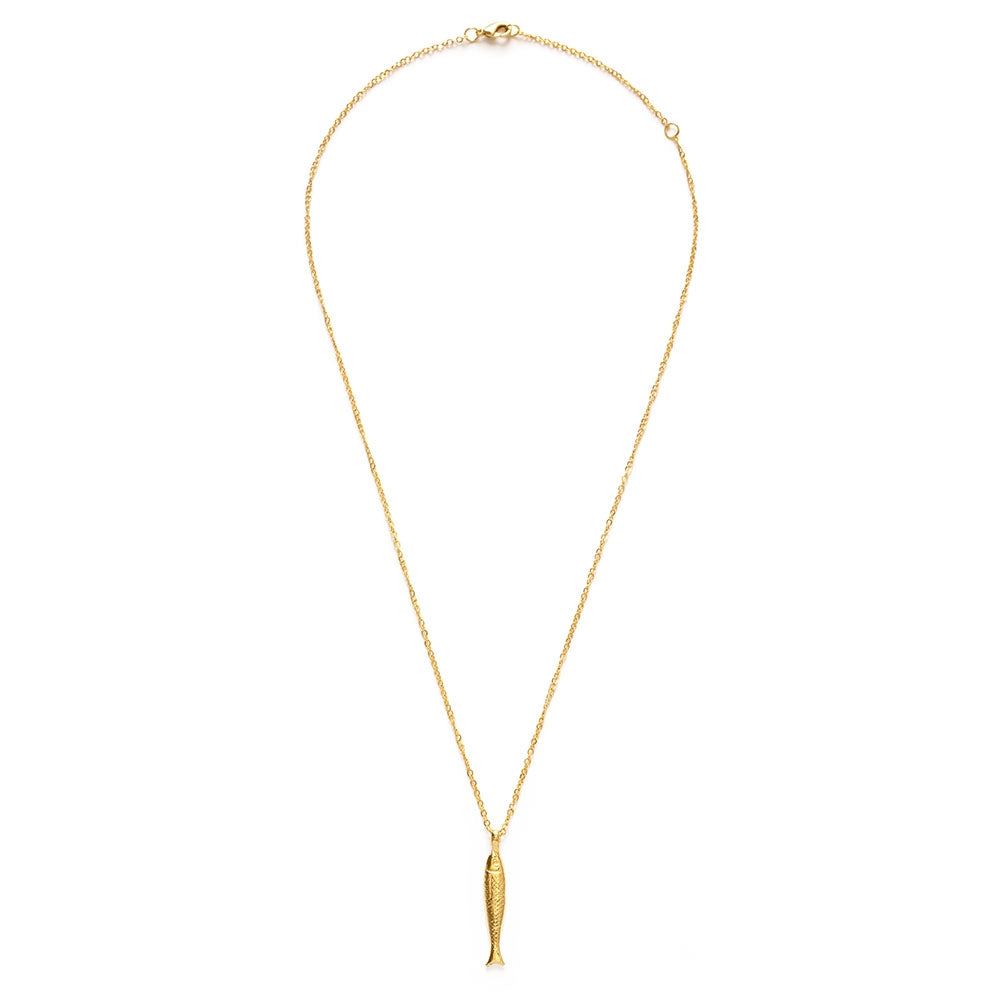 Tinned fish are an iconic trend this season! This beautifully rendered fish hangs from a 20" sparkling cable chain.
