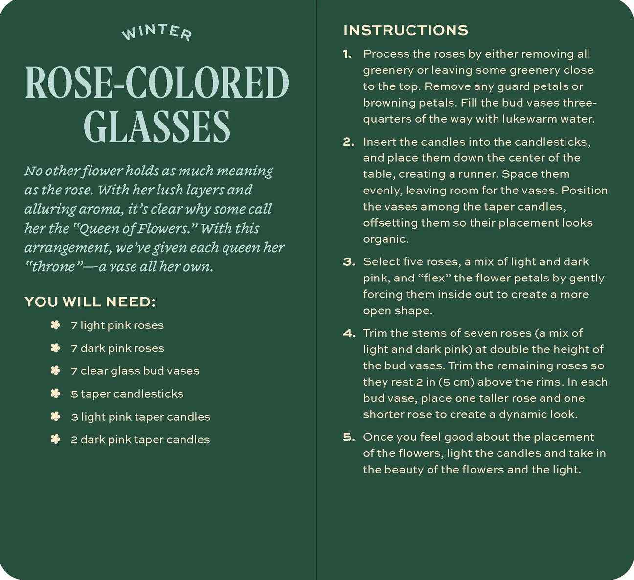 Design stunning floral arrangements for holiday hosting, special occasions, gifting to friends, or simply making any day a little brighter and more beautiful. This easy-to-use deck includes 30 how-to recipe cards for creating gorgeous seasonal arrangements, including: a lush harvest tablescape, a welcoming holiday wreath, a summer-sweet centerpiece for al fresco dining, a 'grateful guest' bundle to present to your host, bouquets for Valentine's Day, Mother's Day, and more.
