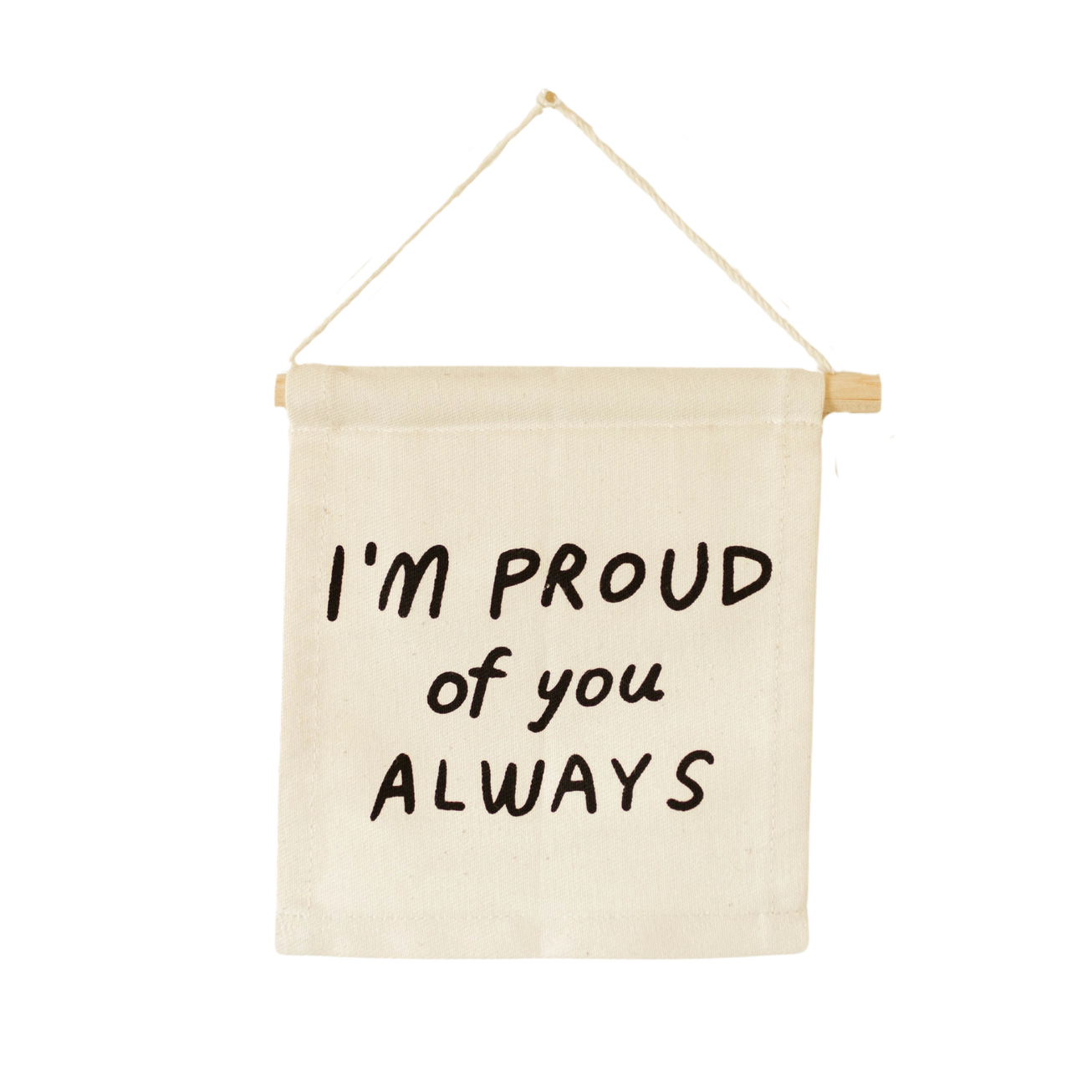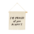 The "I'm Proud of You" wall hanging was sewn and screen printed by hand on natural canvas by local artisan.