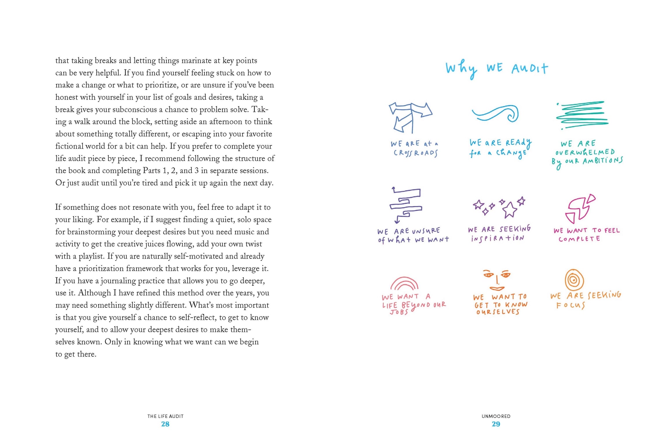 A life-changing and empowering guide to discovering your personal and professional passions, goals, and dreams so you can create a life full of joy and purpose. Welcome to the Life Audit, an exercise in self-reflection that helps you clear the cobwebs of noisy, external goals and distractions, and revisit or uncover the real themes and core values that drive and inspire you. Think of it as spring-cleaning for the soul. For anyone looking to find fulfillment in every aspect of life—love, friendship, career, finances, and beyond—this encouraging handbook offers the tools to prioritize your goals and turn personal insights into action to create a beautiful, meaningful future. In this step-by-step guide, made irresistibly and uniquely engaging by insightful and entertaining illustrations throughout, you’ll learn how to use design thinking and creative exercises to: identify the core values and key themes hidden within your goals, overcome the internal judgments and outside expectations that stifle your growth, find the people, skills, and resources you need to nourish your dreams, design a practical, personal action plan you can follow with confidence and clarity. Whether you’re a recent graduate, contemplating a career change, facing a personal crossroads, or searching for satisfaction, The Life Audit is a safe space for dreaming big, a path to kickstart dreams previously on hold, and a rousing call to design a life that honors your values and desires every day.