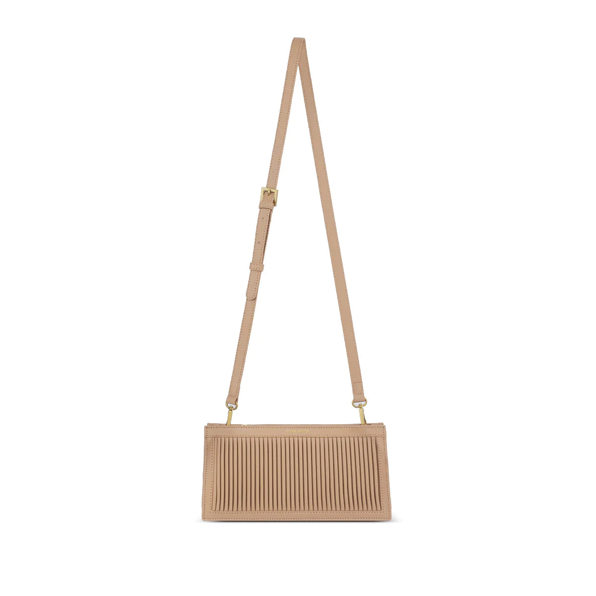 This accordion-style clutch made with a luxurious pleated vegan leather screams elegance when worn without a strap (as a clutch), chic-ness when worn as a shoulder bag, and then cuteness when worn as a crossbody. The shoulder and crossbody straps allow it to be worn three different ways.