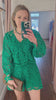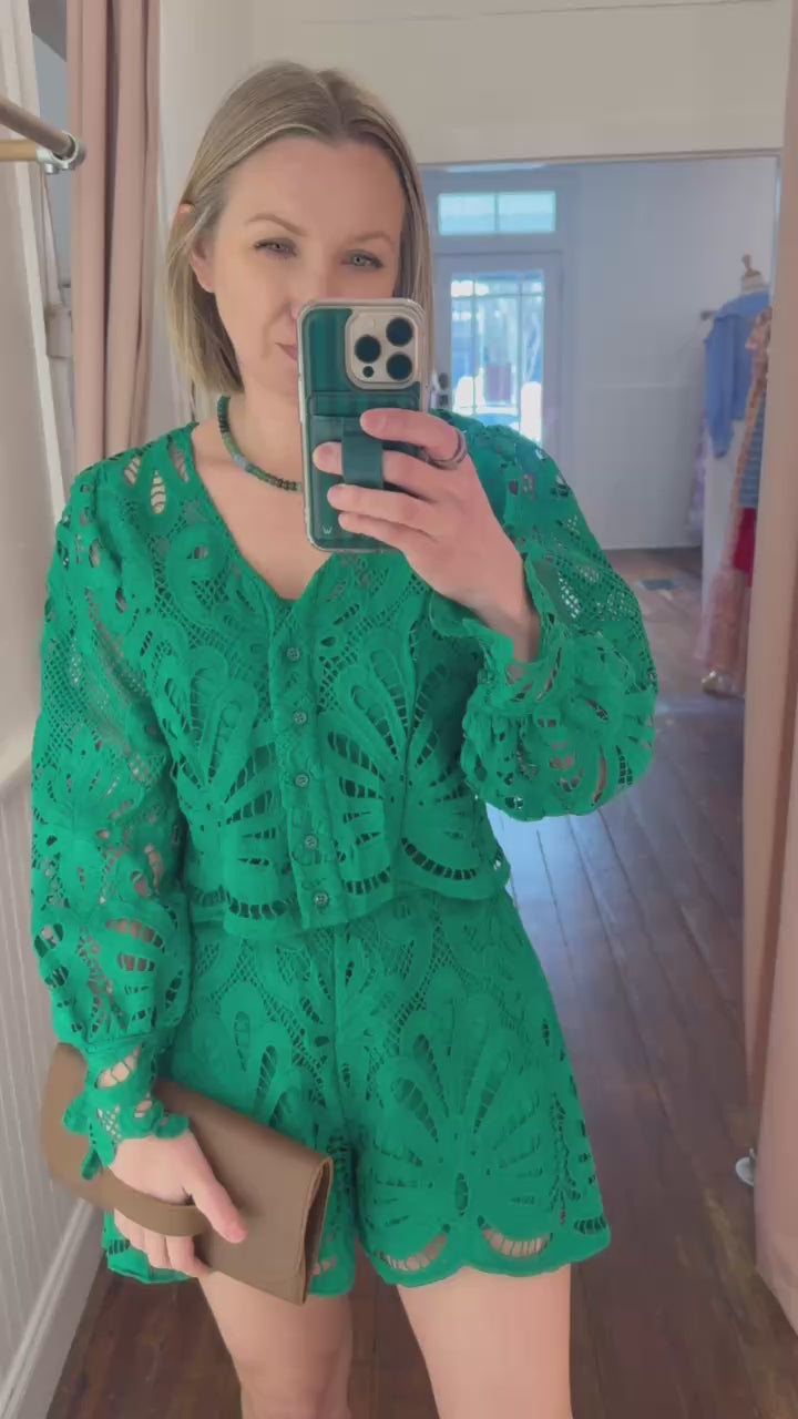 Romantic and lightweight, the Hannah Top features an intricate openwork pattern, a flattering v-neckline, and a button-front closure. Designed with long balloon sleeves and subtle scalloped edges, this airy top offers an elegant yet relaxed silhouette. Perfect for warm-weather styling, vacations, or special daytime occasions. Pair with our Hannah Shorts for a complete set.