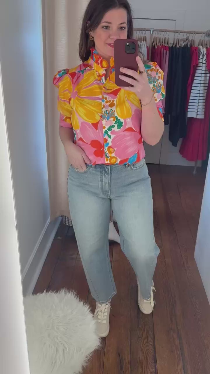 Romantic and refined, the Jodie Top brings effortless elegance to your everyday wardrobe. Designed with short sleeves and a high ruffled neckline, this floral blouse features a delicate button-front detail for a polished finish. The vibrant print adds a fresh, feminine touch—perfect for pairing with denim for a casual look or dressing up with tailored pieces for a chic outfit!
