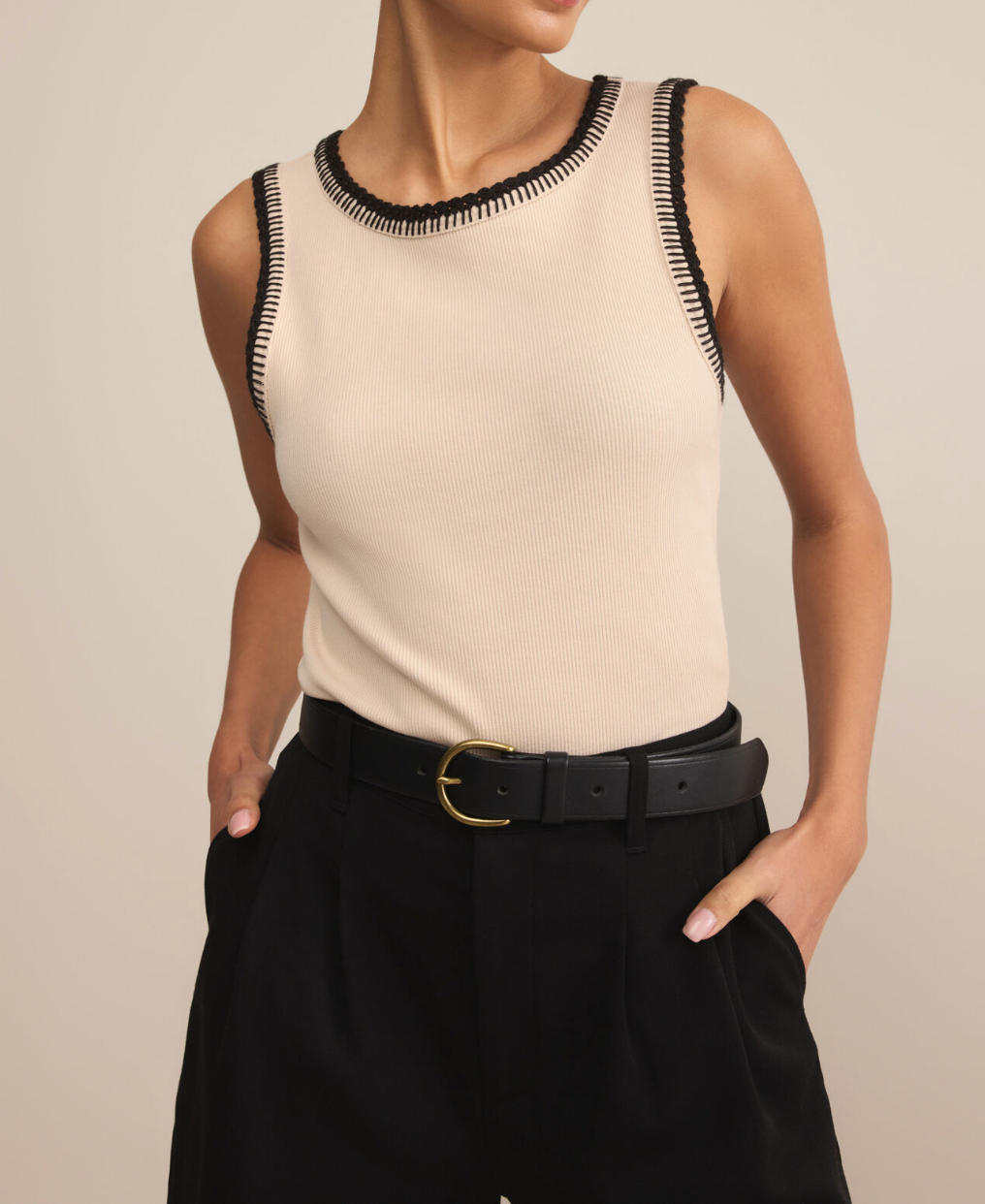 Soft with a little something extra, this sleeveless tank features delicate whipstitch embroidery at the neckline and armholes. Crafted from our favorite Feather Rib fabric with a relaxed crew neck fit, it’s an effortless piece that feels anything but basic.