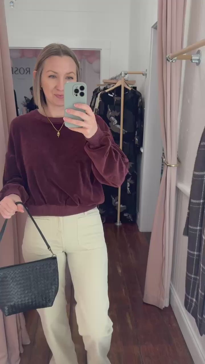 Model is wearing a size small. We find that the Jewel Velour Sweatshirt runs true to size.