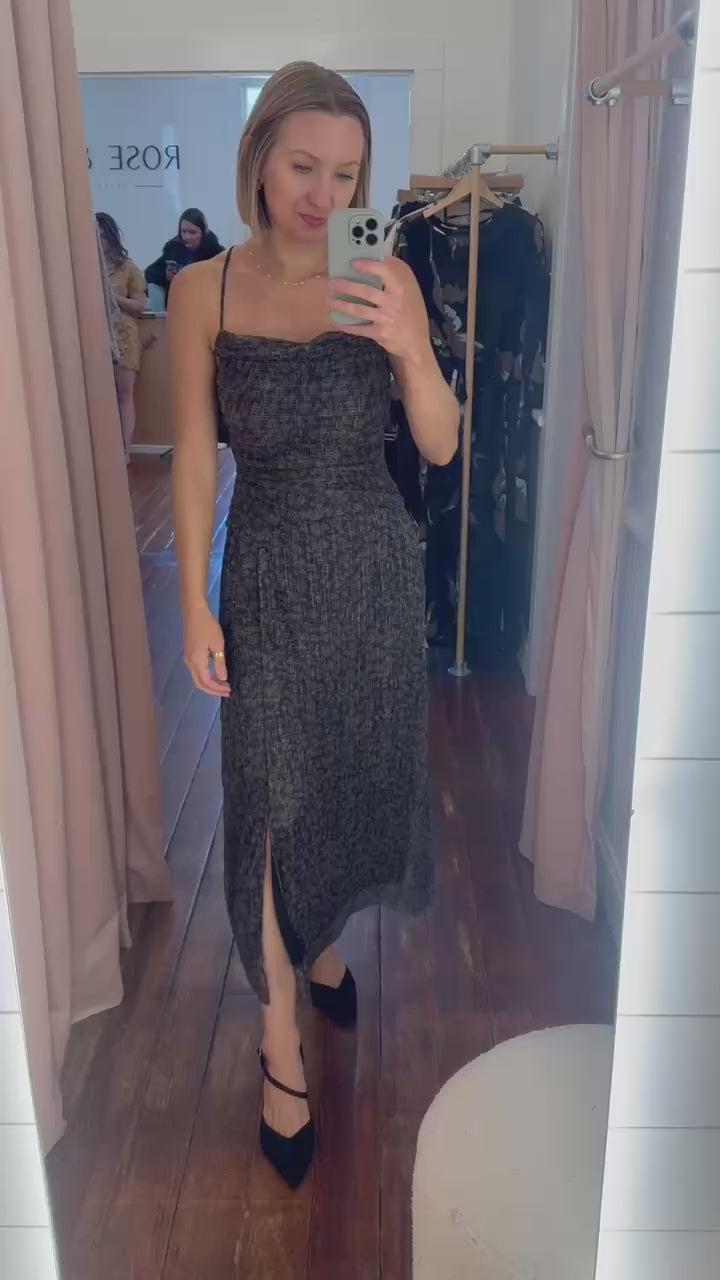 The Whitney Dress in a black and gold mix will be sure to stun at your next event! This dress is perfect for a holiday soiree. This dress features a flattering cowl neckline, an adjustable self-tie back, a high side slit, and a convenient zippered back.