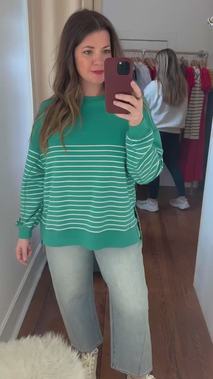 One of our most loved sweatshirts now with a classic stripe. This crewneck sweatshirt is made with our signature baby french terry for that perfect lived-in feel. Soft to the touch, it will be the easy going layer you reach for daily. Pair it with a comfy short or your favorite denim bottoms.