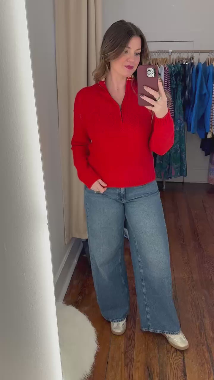 Add a bold pop of color to your wardrobe with the Bellini Sweater in a vibrant red. Featuring a chic stand collar and half-zip design, this sweater blends sporty style with everyday comfort. The relaxed fit makes it perfect for layering or pairing with your favorite jeans for a polished yet effortless look.