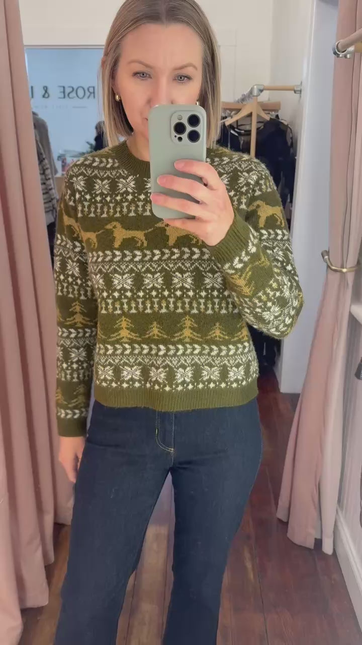 The Priya Sweater is for our dog and holiday lovers! This sweater is adorned with a holiday pattern that features dogs and Christmas trees. You'll be in the Christmas spirit anytime you put this sweater on!