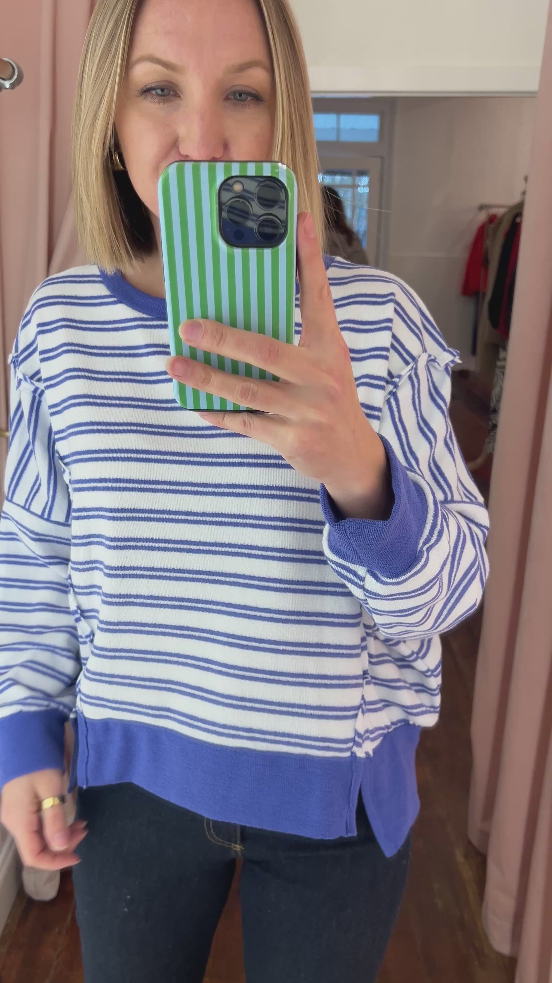 The Raquel Sweatshirt brings a fresh twist to a laid-back classic. Designed with soft fabric and timeless blue stripes, it features a crew neckline and a relaxed fit for all-day comfort. The high-low hemline adds a modern touch, making it perfect for pairing with jeans or leggings.
