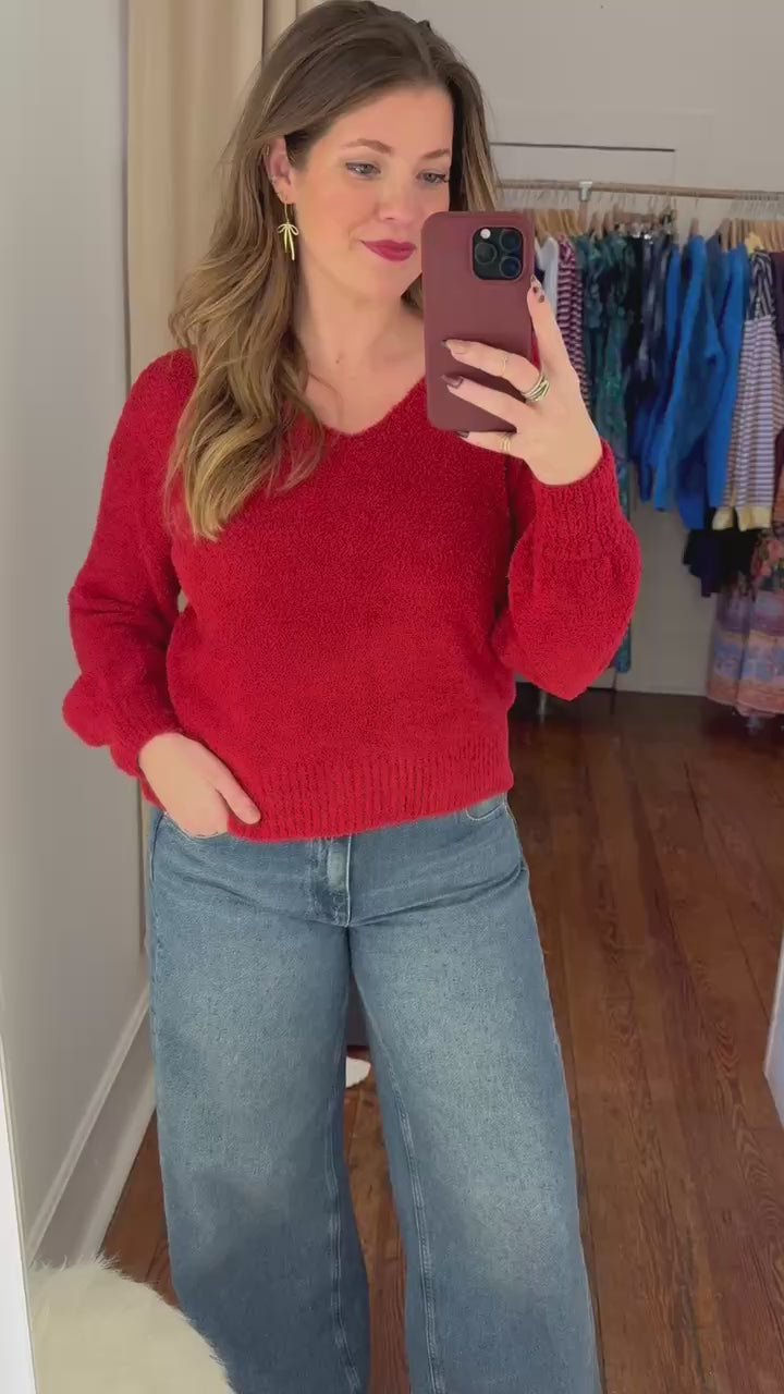 The Teddy Sweater feels like holding a teddy bear, it is seriously that soft! This red sweater is perfect for the holidays and even after. Pair with our Tuxedo Jeans for the perfect outfit.