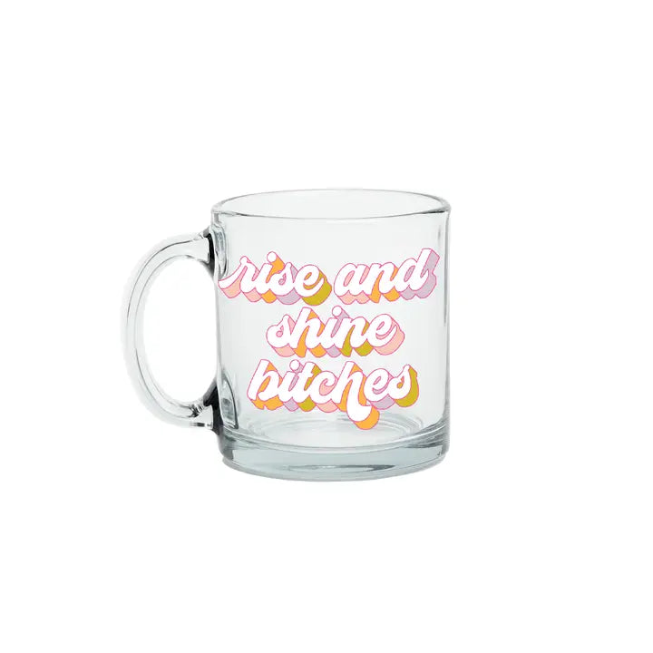 Get ready to "rise and shine, bitches" with this hilarious glass mug perfect for starting your day! The saying on this clear mug will definitely bring some humor to your morning routine.