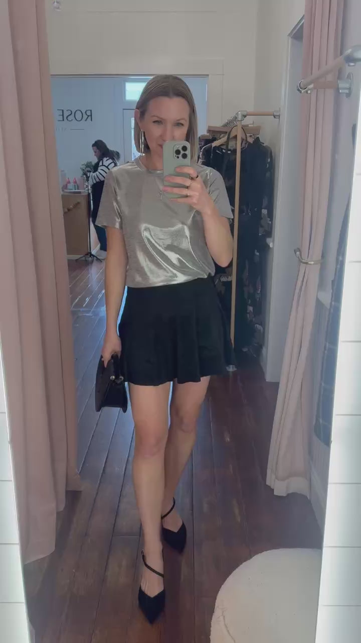 The Zelda Top features a round neckline and is crafted from a soft metallic fabric with a gentle stretch. This silver top is perfect for the holiday season!
