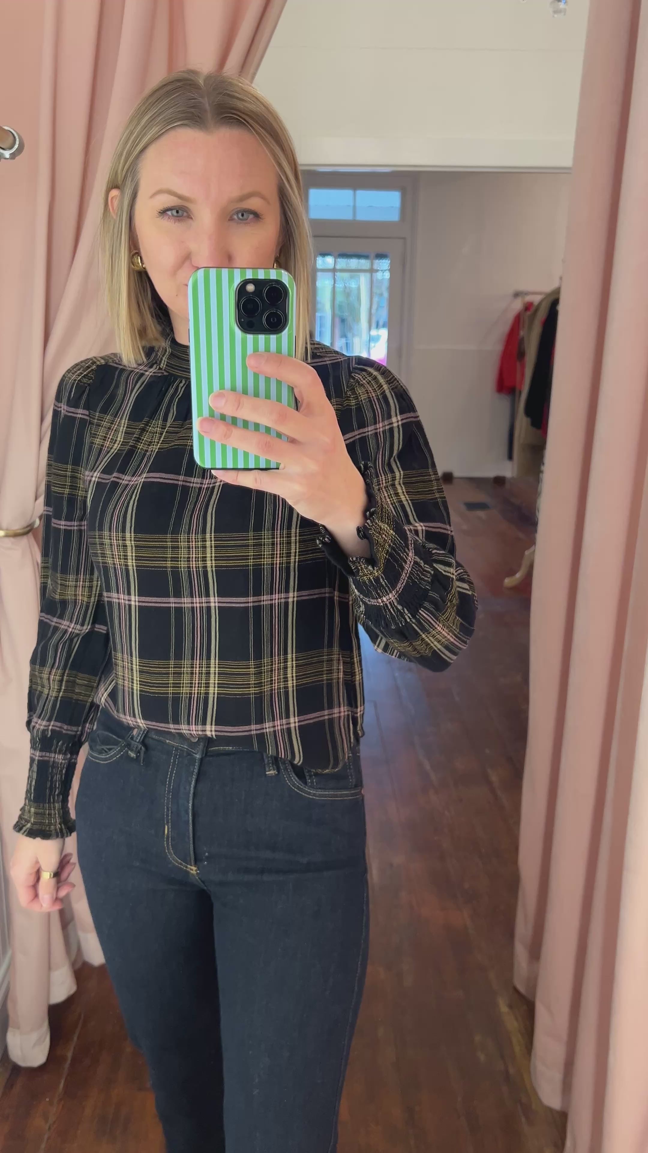 The Arlene Top is a mock neck pop over top that features a classic plaid design and balloon sleeves with smocked cuffs that are crafted from a medium-weight fabric with a soft and subtly structured feel.