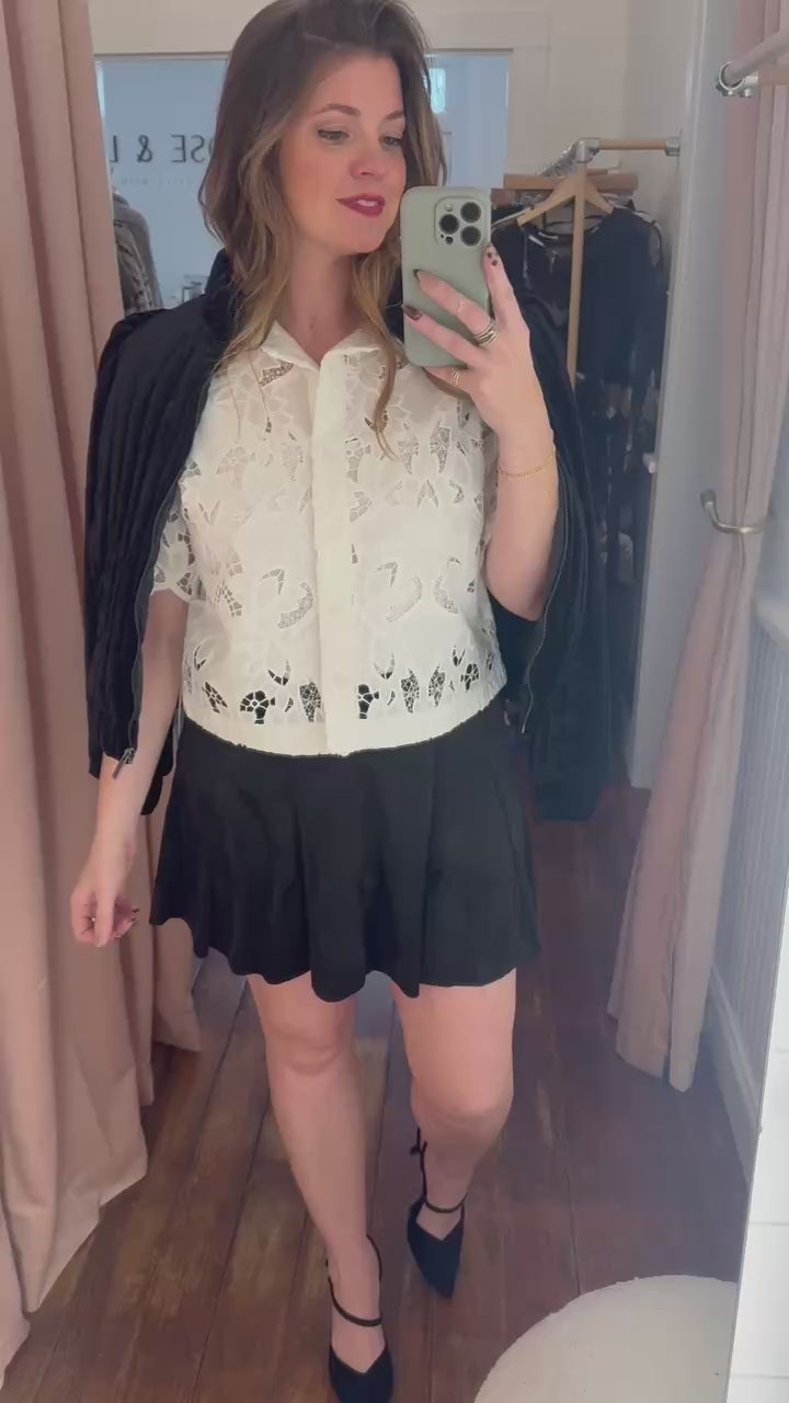 Intricate embroidery and an airy feel make this button-up an easy way to dress up your look. Delicate embroidery meets breezy cotton crepe in this short-sleeve button-up. The collared silhouette and airy fabric make it a polished yet easy layer for day-to-night styling.